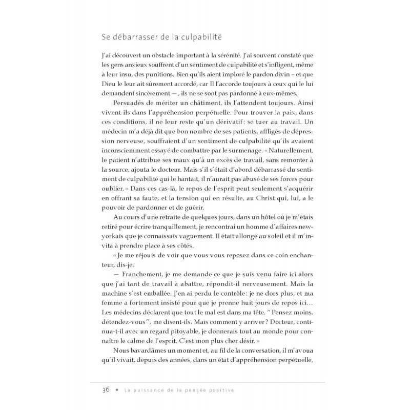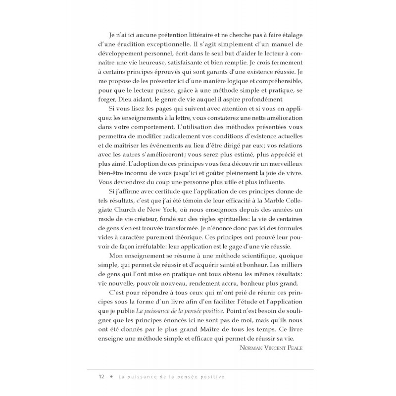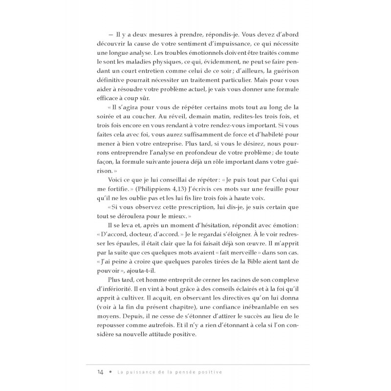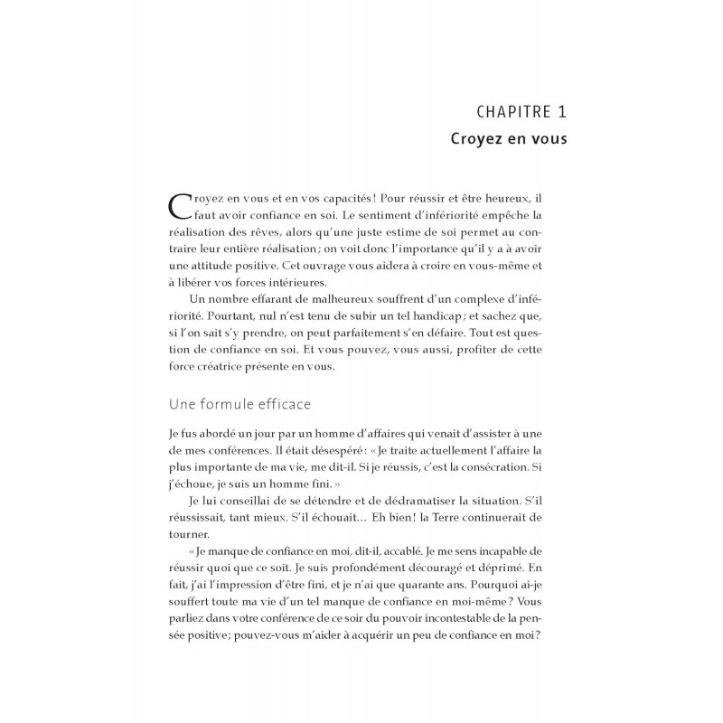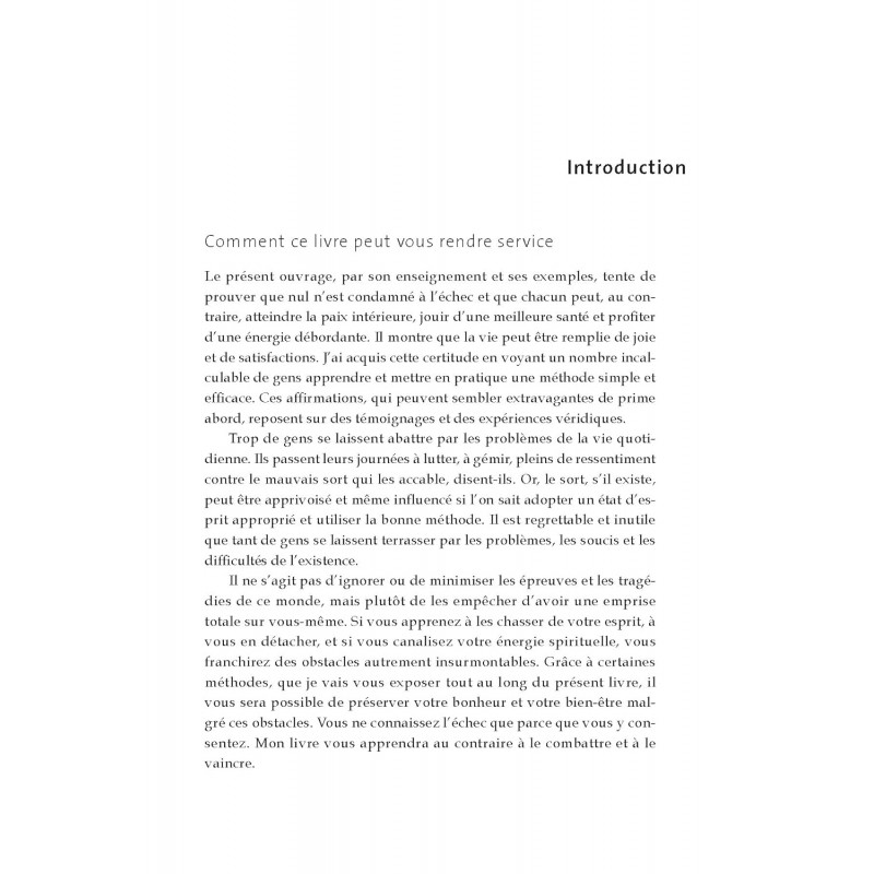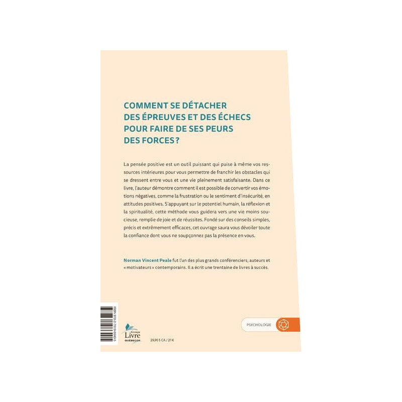 Comment se détacher des épreuves et des échecs pour faire de ses peurs des forces ? La pensée positive est un outil puissant qui puise à même vos ressources intérieures pour vous permettre de franchir les obstacles qui se dressent entre vous et une vie pleinement satisfaisante. Dans ce livre, l'auteur démontre comment il est possible de convertir vos émotions négatives, comme la frustration ou le sentiment d'insécurité, en attitudes positives. S'appuyant sur le potentiel humain, la réflexion, la prière et l'énergie divine, cette méthode vous guidera vers une vie moins soucieuse, remplie de joie et de réussites. Fondé sur des conseils simples, précis et extrêmement efficaces, cet ouvrage saura vous dévoiler toute la confiance dont vous ne soupçonnez pas la présence en vous.