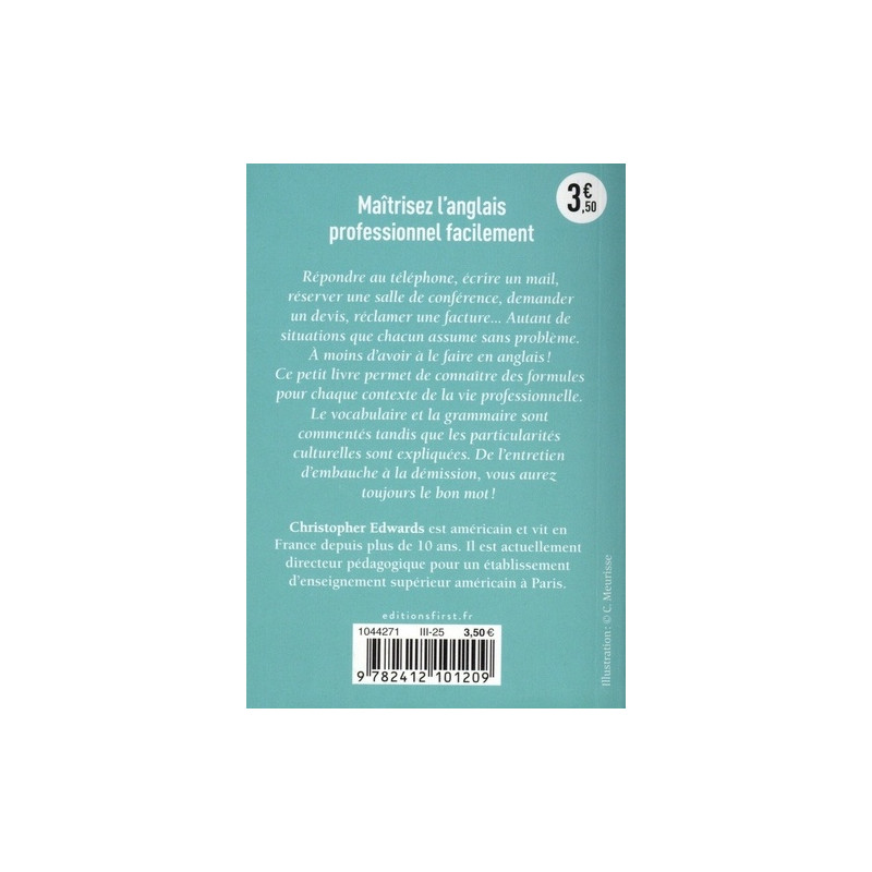 Maîtrisez l'anglais professionnel facilement. Répondre au téléphone, écrire un mail, réserver une salle de conférence, demander un devis, réclamer une facture... Autant de situations que chacun assume sans problème. A moins d'avoir à le faire en anglais ! Ce petit livre permet de connaître des formules pour chaque contexte de la vie professionnelle. Le vocabulaire et la grammaire sont commentés tandis que les particularités culturelles sont expliquées. De l'entretien d'embauche à la démission, vous aurez toujours le bon mot !