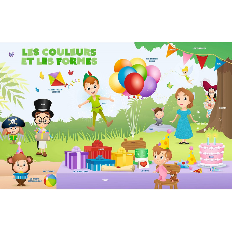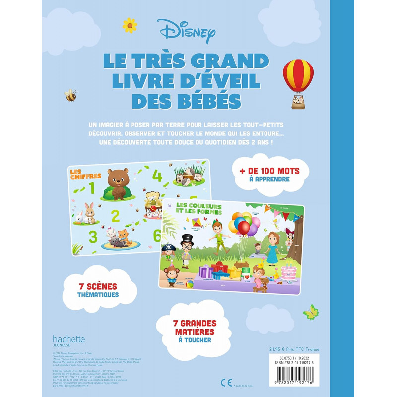 Un livre d'éveil en très grand format, avec plein de matières à toucher ! Un imagier pour accompagner les tout-petits dans leur apprentissage du monde. - 7 scènes thématiques à découvrir pour apprendre en s'amusant ! - + de 100 mots illustrés et adaptés pour les enfants de 2 ans. - Une matière différente sur chaque double page et un miroir pour développer les sens de l'enfant. - Un ouvrage tout-carton avec des coins ronds facilement manipulable pour les petites mains. Contient les thématiques : Les émotions, avec Tristesse, grincheux et Donald ; La savane avec Simba, Les chiffres avec les Aristochats ; Les véhicules avec Pluto, Les contraires Baloo et Dumbo, L'océan avec Ariel, Les formes et les couleurs avec Peter Pan.