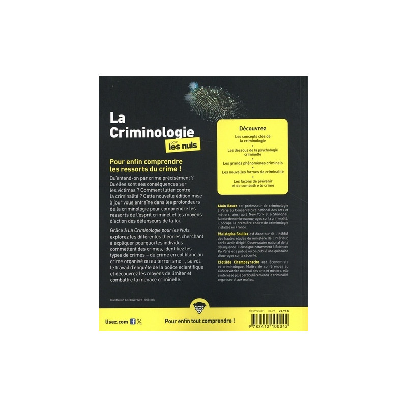 Pour enfin comprendre les ressorts du crime ! Qu'entend-on par crime précisément ? Quelles sont ses conséquences sur les victimes ? Comment lutter contre la criminalité ? Cette nouvelle édition mise à jour vous entraîne dans les profondeurs de la criminologie pour comprendre les ressorts de l'esprit criminel et les moyens d'action des défenseurs de la loi. … Pour enfin comprendre les ressorts du crime ! Qu'entend-on par crime précisément ? Quelles sont ses conséquences sur les victimes ? Comment lutter contre la criminalité ? Cette nouvelle édition mise à jour vous entraîne dans les profondeurs de la criminologie pour comprendre les ressorts de l'esprit criminel et les moyens d'action des défenseurs de la loi. Grâce à La Criminologie pour les Nuls , explorez les différentes théories cherchant à expliquer pourquoi les individus commettent des crimes, identifiez les types de crimes ; du crime en col blanc au crime organisé ou au terrorisme, suivez le travail d'enquête de la police scientifique et découvrez les moyens de limiter et combattre la menace criminelle.