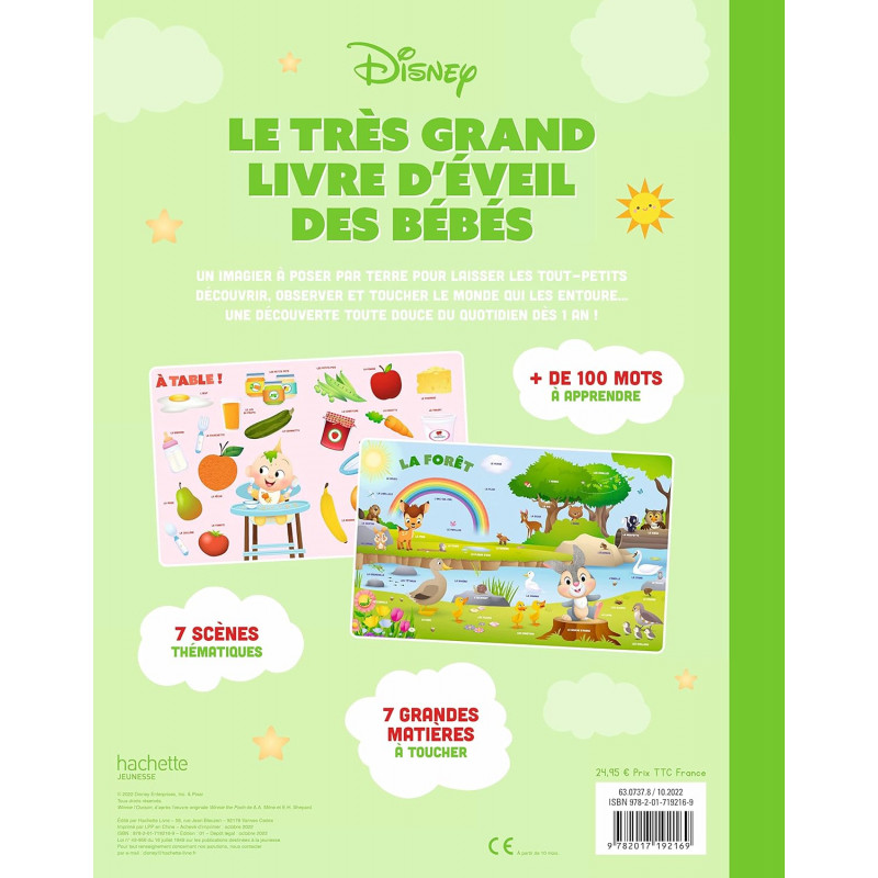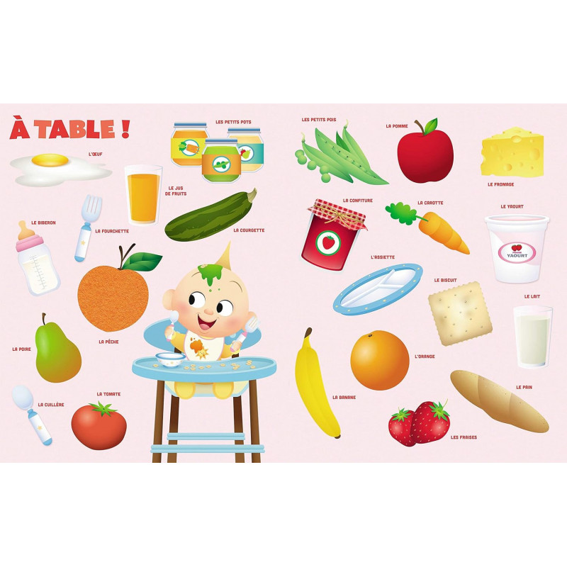 Un livre d'éveil en très grand format, avec plein de matières à toucher ! Un imagier pour accompagner les tout-petits dans leur apprentissage du monde. - 7 scènes thématiques à découvrir pour apprendre en s'amusant ! - + de 100 mots illustrés et adaptés pour les enfants de 1 an. - Une matière différente sur chaque double page et un miroir pour développer les sens de l'enfant. - Un ouvrage tout-carton avec des coins ronds facilement manipulable pour les petites mains.