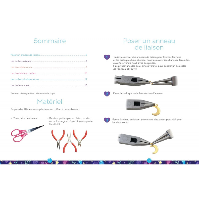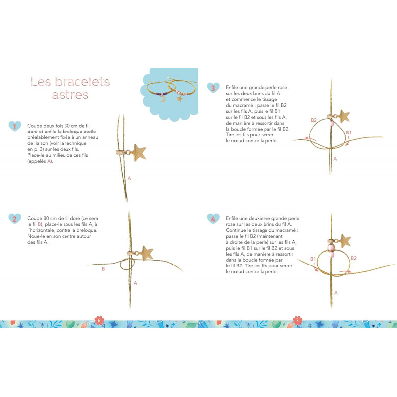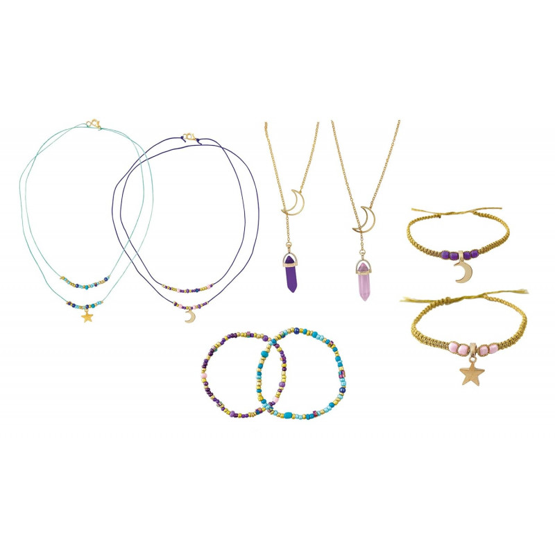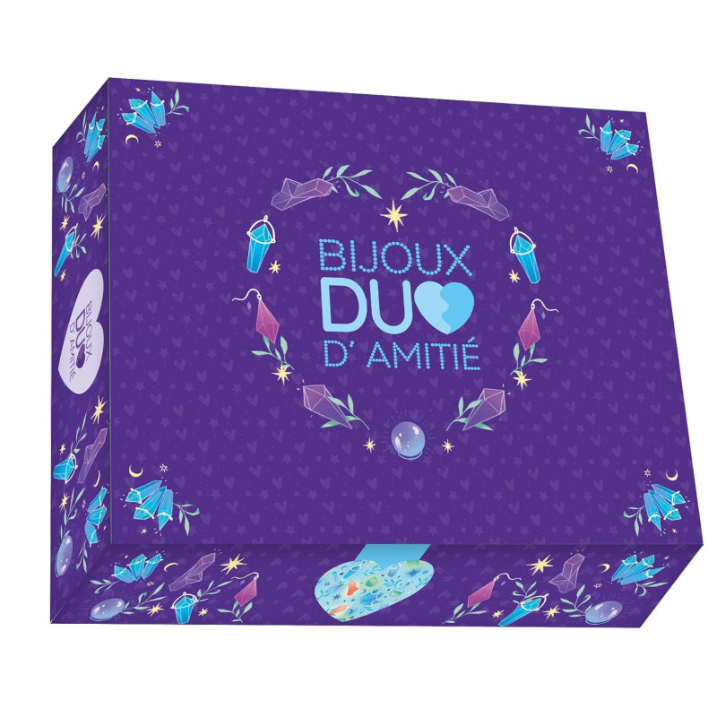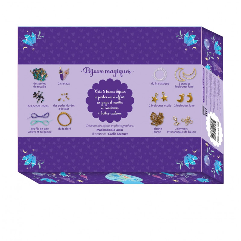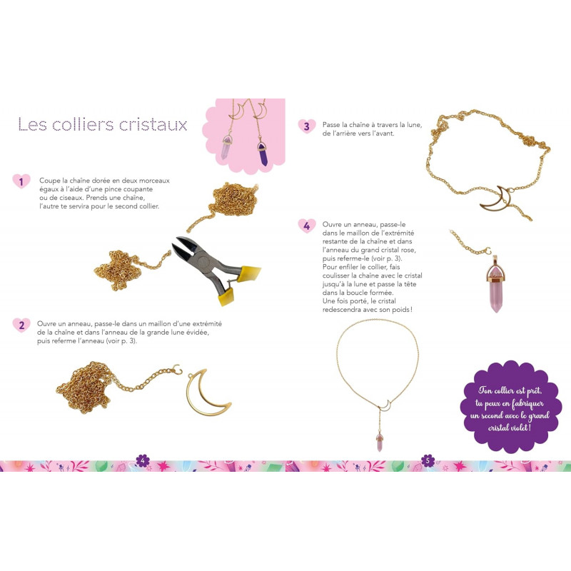Un coffret contenant tout le matériel nécessaire à la création de 8 bijoux d'amitié, fonctionnant par paire (4 bracelets et 4 colliers), sur le thème des cristaux et bijoux magiques, accompagné d'un livret de 16 pages avec des pas-à-pas illustrés. L'un est à garder, l'autre est à offrir à son âme sœur. Ce coffret contient aussi 4 boîtes en papier, joliment illustrées, à compléter d'un petit mot puis à construire, pour y glisser son bijou à offrir. Un beau cadeau, réalisé entièrement par l'enfant et personnalisé. 2 colliers avec une chaîne dorée et un cristal en pendentif ; 2 bracelets en macramé doré avec un cristal en pendentif ; 2 colliers et 2 bracelets en double-rang composés de perles de rocailles et des breloques étoile et lune sur des fils de jade.