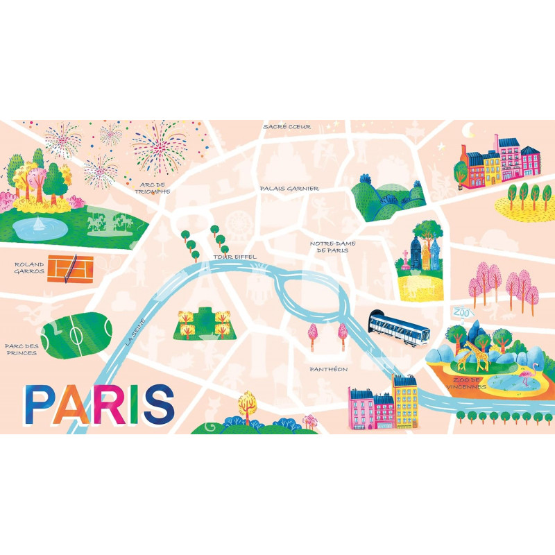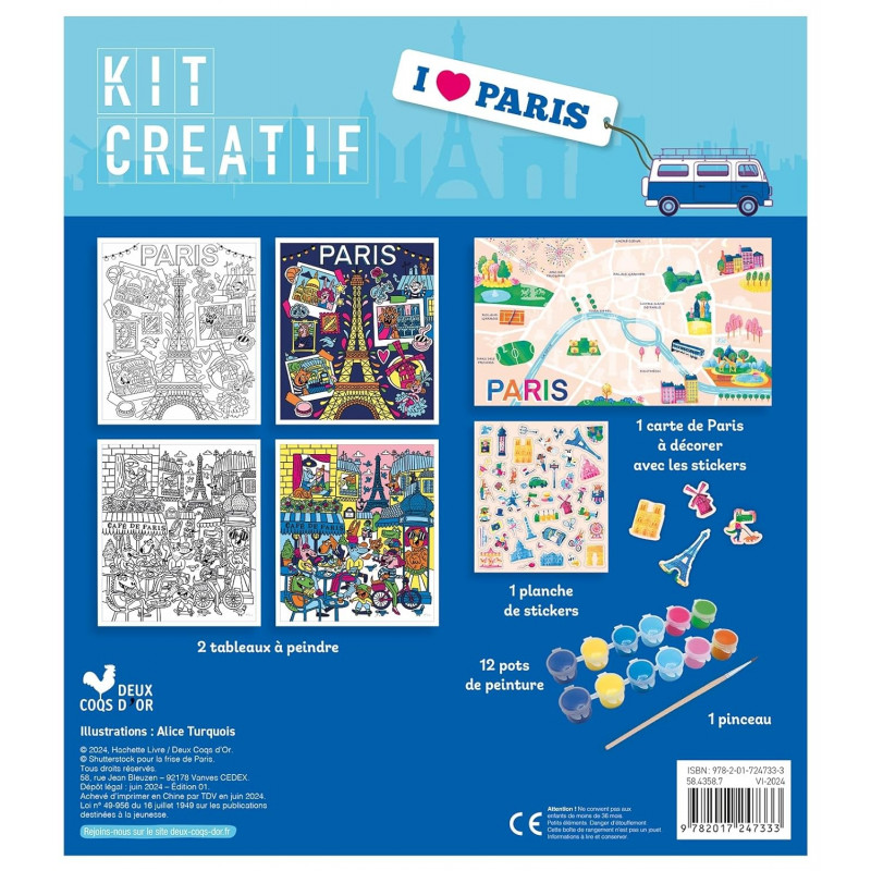 Une boîte d'activités artistiques sur la thématique du voyage aux couleurs de Paris contenant contenant 2 tableaux à peindre grâce à 12 godets de couleurs et 1 pinceau,1 poster qui représente une carte Paris (format 460 x 263 mm) à compléter avec une planche de stickers et un pas à pas.