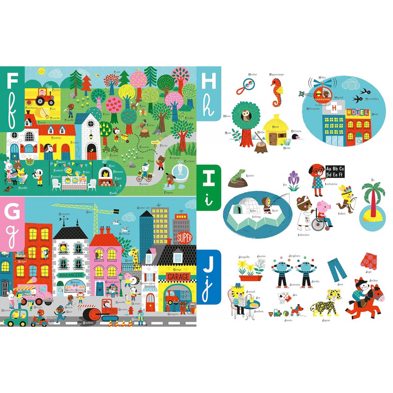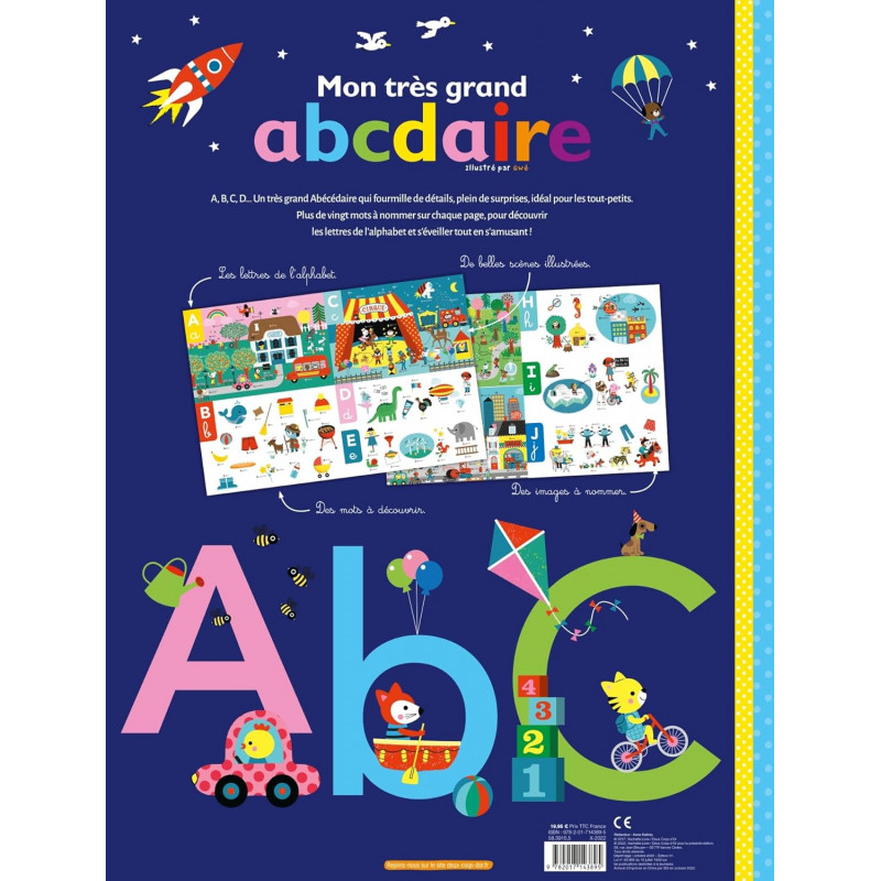 Des lettres de belle taille écrites en majuscule et minuscule pour faciliter la mémorisation par l'enfant. Des scénettes et des petits visuels qui illustrent une foule de mots en lien avec la lettre en regard. Des mots proches du quotidien des petits. Un premier apprentissage de l'alphabet.