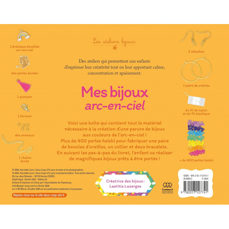 Voici une boîte qui contient tout le matériel nécessaire à la création d'une parure de bijoux aux couleurs de l'arc-en-ciel ! Plus de 400 perles heishi pour fabriquer une paire de boucles d'oreilles, un collier et deux bracelets. En suivant les pas-à-pas du livret, l'enfant va réaliser de magnifiques bijoux prêts à être portés !