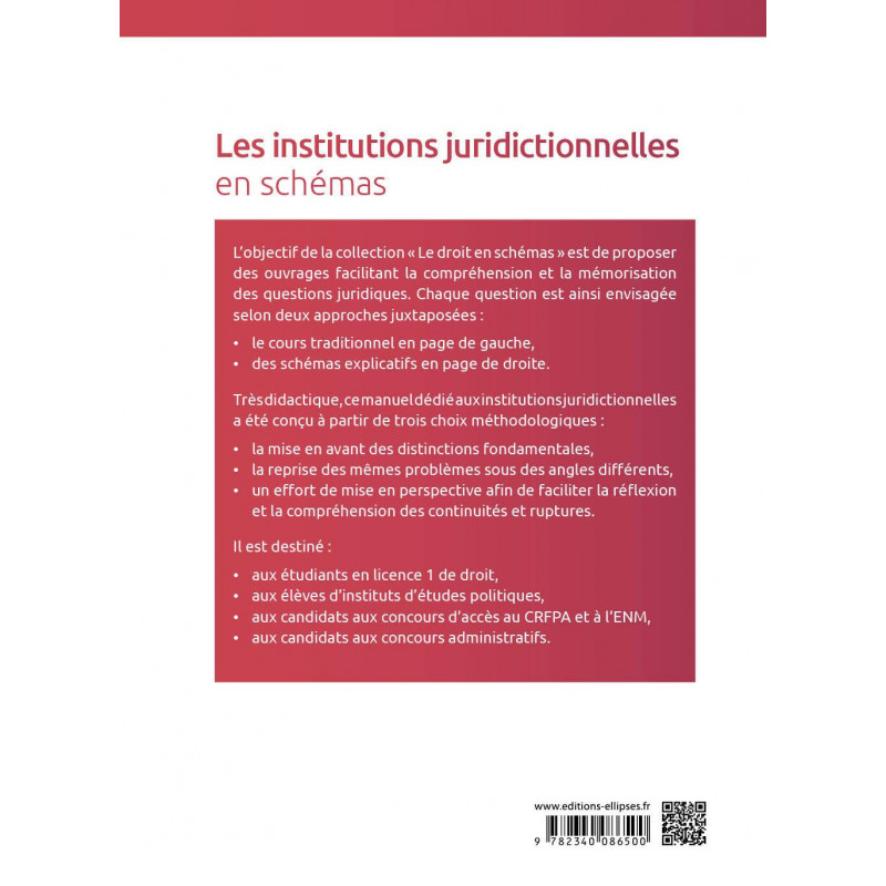 L'objectif de la collection "Le droit en schémas" est de proposer des ouvrages facilitant la compréhension et la mémorisation des questions juridiques. Chaque question est ainsi envisagée selon deux approches juxtaposées : - le cours traditionnel en page de gauche, - des schémas explicatifs en page de droite. Très didactique, ce manuel dédié aux institution… L'objectif de la collection "Le droit en schémas" est de proposer des ouvrages facilitant la compréhension et la mémorisation des questions juridiques. Chaque question est ainsi envisagée selon deux approches juxtaposées : - le cours traditionnel en page de gauche, - des schémas explicatifs en page de droite. Très didactique, ce manuel dédié aux institutions juridictionnelles a été conçu à partir de trois choix méthodologiques : - la mise en avant des distinctions fondamentales ; - la reprise des mêmes problèmes sous des angles différents ; - un effort de mise en perspective afin de faciliter la réflexion et la compréhension des continuités et ruptures. Il est destiné : - aux étudiants en licence 1 de droit ; - aux élèves d'instituts d'études politiques ; - aux candidats aux concours d'accès au CRFPA et à l'ENM ; - aux candidats aux concours administratifs