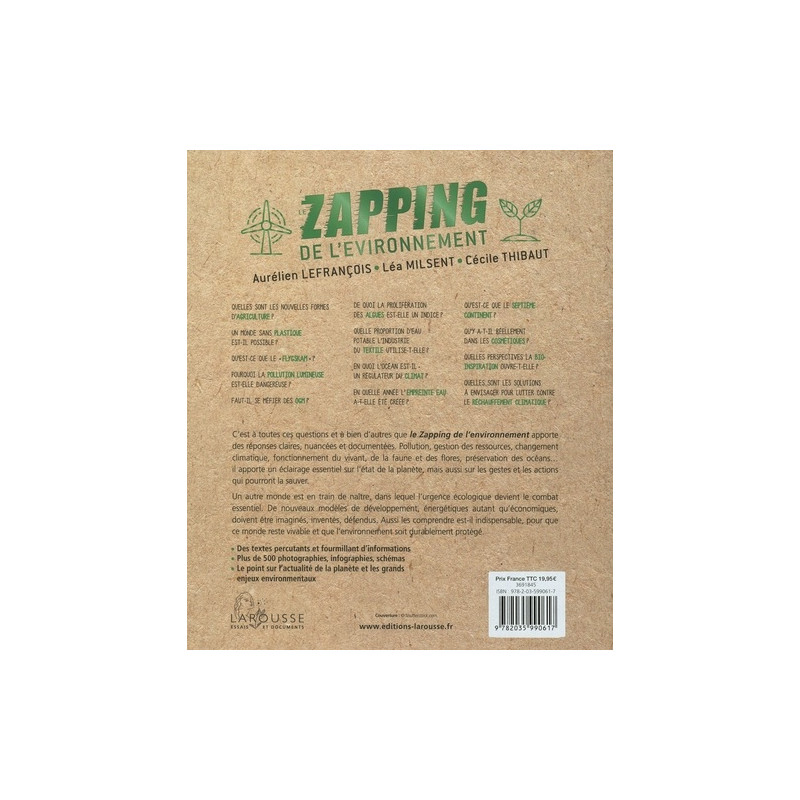 Quelles sont les nouvelles formes d'agriculture ? Un monde sans plastique est-il possible ? Qu'est-ce que le "flygskam" ? Pourquoi la pollution lumineuse est-elle dangereuse ? Faut-il se méfier des OGM ? De quoi la prolifération des algues est-elle un indice ? Quelle proportion d'eau potable l'industrie du textile utilise-t-elle ? En quoi l'océan est-il un régulateur … Quelles sont les nouvelles formes d'agriculture ? Un monde sans plastique est-il possible ? Qu'est-ce que le "flygskam" ? Pourquoi la pollution lumineuse est-elle dangereuse ? Faut-il se méfier des OGM ? De quoi la prolifération des algues est-elle un indice ? Quelle proportion d'eau potable l'industrie du textile utilise-t-elle ? En quoi l'océan est-il un régulateur du climat ? En quelle année l'empreinte eau a-t-elle été créée ? Qu'est-ce que le septième continent ? Qu'y a-t-il réellement dans les cosmétiques ? Quelles perspectives la bio-inspiration ouvre-t-elle ? Quelles sont les solutions a envisager pour lutter contre le réchauffement climatique ? C'est à toutes ces questions et à bien d'autres que le Zapping de l'environnement apporte des réponses claires, nuancées et documentées. Pollution, gestion des ressources, changement climatique, fonctionnement du vivant, de la faune et des flores, préservation des océans... il apporte un éclairage essentiel sur l'état de la planète, mais aussi sur les gestes et les actions qui pourront la sauver. Un autre monde est en train de naître, dans lequel l'urgence écologique devient le combat essentiel. De nouveaux modèles de développement, énergétiques autant qu'économiques, doivent être imaginés, inventés, défendus. Aussi les comprendre est-il indispensable, pour que ce monde reste vivable et que l'environnement soit durablement protégé. Des textes percutants et fourmillant d'informations. Plus de 500 photographies, infographies, schémas. Le point sur l'actualité de la planète et les grands enjeux.