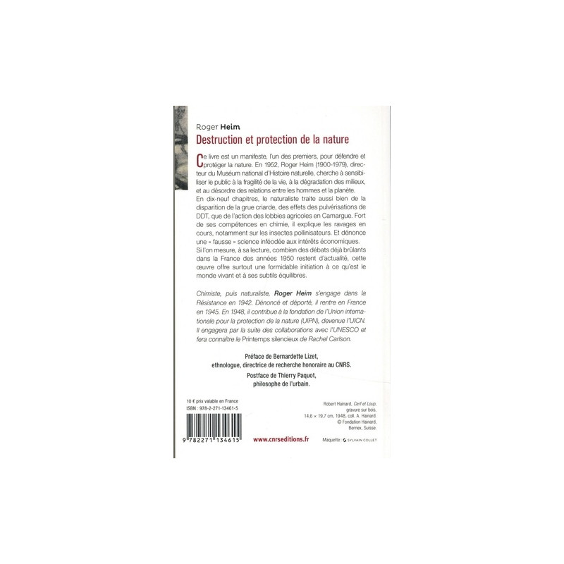 Ce livre est un manifeste, l'un des premiers, pour défendre et protéger la nature. En 1952, Roger Heim (1900-1979), directeur du Muséum national d'Histoire naturelle, cherche à sensibiliser le public à la fragilité de la vie, à la dégradation des milieux, et au désordre des relations entre les hommes et la planète. En dix-neuf chapitres, le naturaliste traite aussi… Ce livre est un manifeste, l'un des premiers, pour défendre et protéger la nature. En 1952, Roger Heim (1900-1979), directeur du Muséum national d'Histoire naturelle, cherche à sensibiliser le public à la fragilité de la vie, à la dégradation des milieux, et au désordre des relations entre les hommes et la planète. En dix-neuf chapitres, le naturaliste traite aussi bien de la disparition de la grue criarde, des effets des pulvérisations de DDT, que de l'action des lobbies agricoles en Camargue. Fort de ses compétences en chimie, il explique les ravages en cours, notamment sur les insectes pollinisateurs. Et dénonce une " fausse " science inféodée aux intérêts économiques. Si l'on mesure, à sa lecture, combien des débats déjà brûlants dans la France des années 1950 restent d'actualité, cette œuvre offre surtout une formidable initiation à ce qu'est le monde vivant et à ses subtils équilibres.