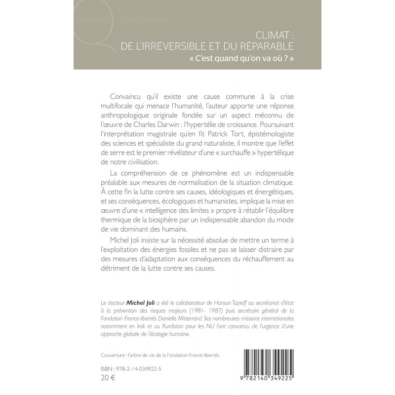 Convaincu qu'il existe une cause commune à la crise multifocale qui menace l'humanité, l'auteur apporte une réponse anthropologique originale fondée sur un aspect méconnu de l'œuvre de Charles Darwin : l'hypertélie de croissance. Poursuivant l'interprétation magistrale qu'en fit Patrick Tort, épistémologiste des sciences et spécialiste du grand naturaliste, il montre que l'effet de serre est le premier révélateur d'une "surchauffe" hypertélique de notre civilisation. La compréhension de ce phénomène est un indispensable préalable aux mesures de normalisation de la situation climatique. A cette fin la lutte contre ses causes, idéologiques et énergétiques, et ses conséquences, écologiques et humanistes, implique la mise en œuvre d'une "intelligence des limites" propre à rétablir l'équilibre thermique de la biosphère par un indispensable abandon du mode de vie dominant des humains. Michel Joli insiste sur la nécessité absolue de mettre un terme à l'exploitation des énergies fossiles et ne pas se laisser distraire par des mesures d'adaptation aux conséquences du réchauffement au détriment de la lutte contre ses causes.