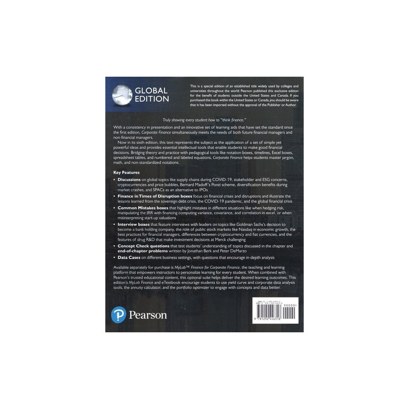 Grâce à une présentation cohérente et à un ensemble innovant d'outils pédagogiques qui font référence depuis la première édition, Finance d'entreprise répond aux besoins des futurs managers financiers et non financiers. Dans sa sixième édition, ce manuel présente le sujet comme l'application d'idées simples mais percutantes et propose … Grâce à une présentation cohérente et à un ensemble innovant d'outils pédagogiques qui font référence depuis sa première édition, Corporate Finance répond aux besoins des futurs managers financiers et non financiers. Dans sa sixième édition, ce manuel présente la matière comme l'application d'idées simples mais percutantes et fournit des outils intellectuels essentiels pour permettre aux étudiants de prendre de bonnes décisions financières. Alliant théorie et pratique grâce à des outils pédagogiques tels que les encadrés, les chronologies, les tableaux Excel, les feuilles de calcul et les équations numérotées et étiquetées, Corporate Finance aide les étudiants à maîtriser le jargon, les mathématiques et les notations non standardisées. Caractéristiques principales - Discussions sur des sujets mondiaux tels que les chaînes d'approvisionnement pendant la COVID-19, les préoccupations des parties prenantes et ESG, les cryptomonnaies et les bulles de prix, le système de Ponzi de Bernard Madoff, les avantages de la diversification pendant les krachs boursiers et les SPAC comme alternative aux introductions en bourse - Les encadrés sur la finance en temps de perturbation se concentrent sur les crises et les perturbations financières et illustrent les leçons tirées de la crise de la dette souveraine, de la pandémie de COVID-19 et de la crise financière mondiale - Les encadrés sur les erreurs courantes qui mettent en évidence les erreurs dans différentes situations, comme lors de la couverture des risques, de la manipulation du TRI avec le calcul de la variance, de la covariance et de la corrélation dans Excel, ou lors d'une mauvaise interprétation des valorisations des start-up - Les encadrés d'entretiens qui présentent des entretiens avec des dirigeants sur des sujets tels que la décision de Goldman Sachs de devenir une société holding bancaire, le rôle des marchés boursiers publics comme le Nasdaq dans la croissance économique, les meilleures pratiques pour les gestionnaires financiers, les différences entre les cryptomonnaies et les monnaies fiduciaires, et les caractéristiques de la R&D pharmaceutique qui rendent les décisions d'investissement chez Merck difficiles - Questions de vérification des concepts qui testent la compréhension des étudiants des sujets abordés dans le chapitre et les problèmes de fin de chapitre Rédigé par Jonathan Berk et Peter DeMarzo - Études de cas sur différents contextes commerciaux, avec des questions favorisant une analyse approfondie. MyLab Finance pour la finance d'entreprise est disponible séparément à l'achat.