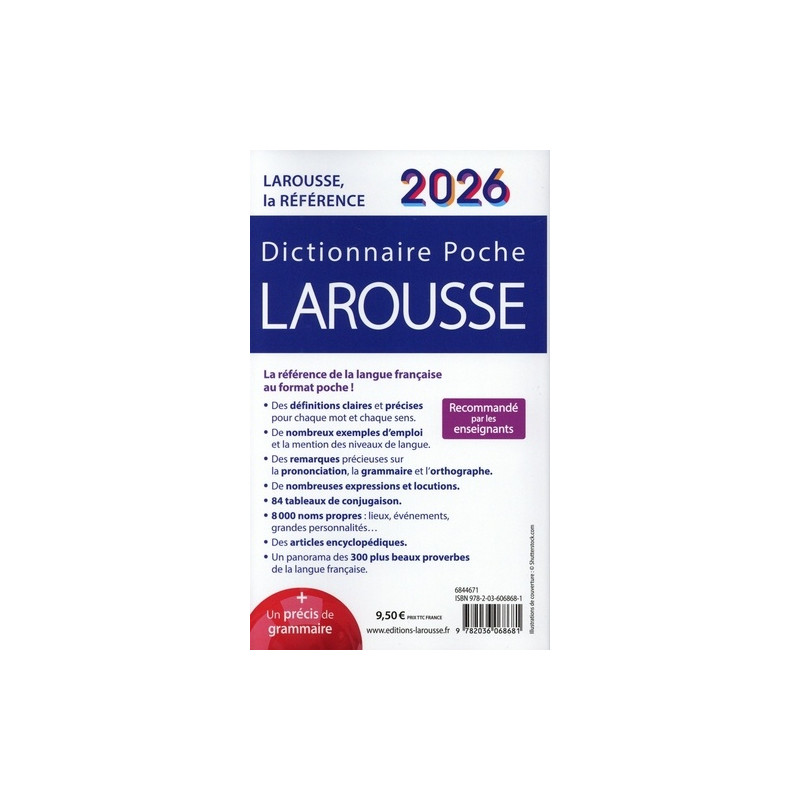 La référence de la langue française au format poche ! Des définitions claires et précises pour chaque mot et chaque sens. De nombreux exemples d'emploi et la mention des niveaux de langue. Des remarques précieuses sur la prononciation, la grammaire et l'orthographe. De nombreuses expressions et locutions. 84 tableaux de conjugaison. 8000 noms propres … La référence de la langue française au format poche ! Des définitions claires et précises pour chaque mot et chaque sens. De nombreux exemples d'emploi et la mention des niveaux de langue. Des remarques précieuses sur la prononciation, la grammaire et l'orthographe. De nombreuses expressions et locutions. 84 tableaux de conjugaison. 8000 noms propres : lieux, événements, grandes personnalités... Des articles encyclopédiques. Un panorama des 300 plus beaux proverbes de la langue française. + Un précis de grammaire.