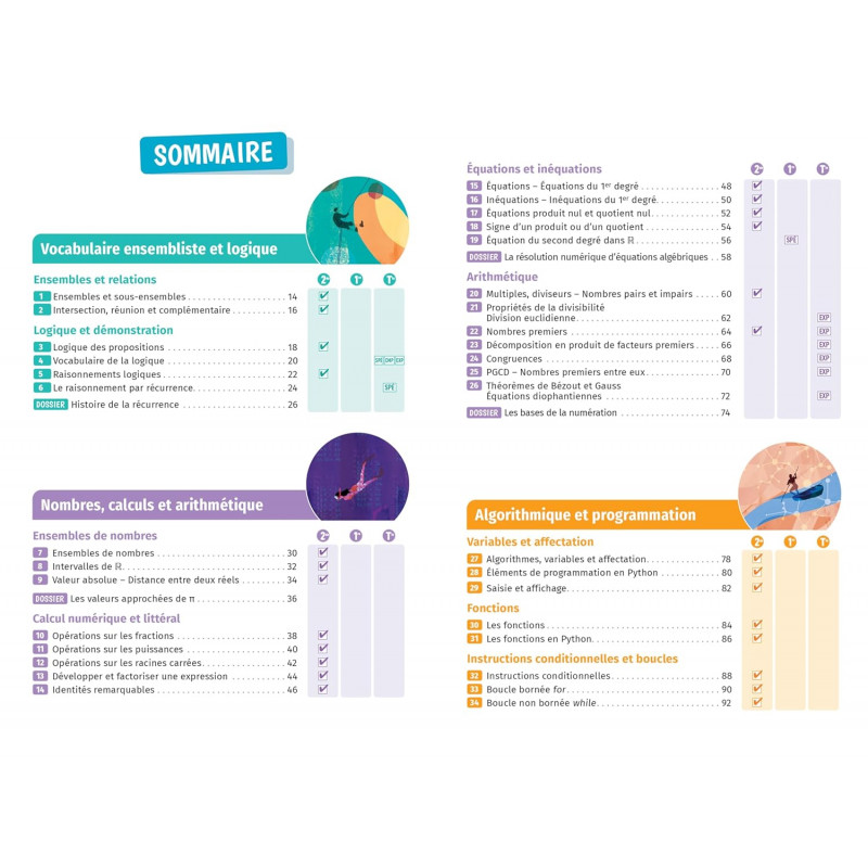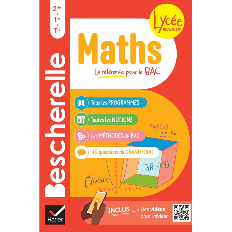 L'ouvrage de référence en maths pour le lycée : tous les programmes, de la 2de à la Tle, avec toutes les notions et les méthodes du bac. Egalement des dossiers de culture mathématique et des vidéos ! Un ouvrage fiable et complet - L'ouvrage traite de l'ensemble des programmes de Maths au lycée : 2de, 1re spécialité, 1re tronc commun, Tle spécialité… L'ouvrage de référence en maths pour le lycée : tous les programmes, de la 2de à la Tle, avec toutes les notions et les méthodes du bac. Egalement des dossiers de culture mathématique et des vidéos ! Un ouvrage fiable et complet - L'ouvrage traite de l'ensemble des programmes de Maths au lycée : 2de, 1re spécialité, 1re tronc commun, Tle spécialité, Tle options Maths complémentaires et Maths expertes. - Pour chaque notion : - les définitions et propriétés essentielles, avec des exemples d'application, - les méthodes à maîtriser, expliquées étape par étape à travers des exercices résolus. - A intervalles réguliers, des dossiers illustrés sur le développement des maths et leurs applications, avec des exemples de questions de Grand Oral. - En ligne, des vidéos explicatives sur les notions clés du programme de Tle. Un ouvrage facile à utiliser - Les notions sont réparties en 7 sections correspondant aux grandes parties du programme. - Chaque notion est associée à une indication du niveau à partir duquel elle est introduite. - Un index détaillé en fin d'ouvrage facilite la recherche d'une notion ou d'une méthode. Pour qui ? L'ouvrage concerne les lycéens de la 2deà la Tle : - tous les élèves de 2de, - ceux de 1re, qu'ils suivent l'enseignement de tronc commun ou qu'ils aient choisi la spécialité Maths, - ceux de Tle qui ont gardé la spécialité (avec ou sans l'option Maths expertes) ou qui ont choisi l'option Maths complémentaires.