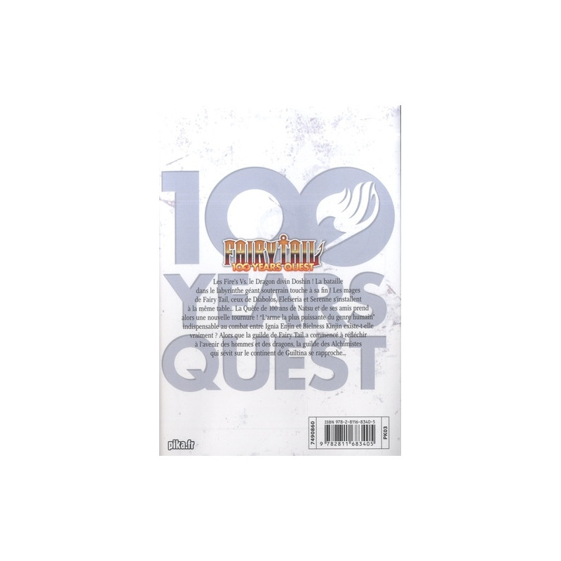 Les Fire's Vs. le Dragon divin Doshin ! La bataille dans le labyrinthe géant souterrain touche à sa fin ! Les mages de Fairy Tail, ceux de Diabolos, Elefseria et Serenne s'installent à la même table... La Quête de 100 ans de Natsu et de ses amis prend alors une nouvelle tournure ! "L'arme la plus puissante du genre humain" indispensable au combat entre Ignia Enjin et Bielness Kinjin existe-t-elle vraiment ? Alors que la guilde de Fairy Tail a commencé à réfléchir à l'avenir des hommes et des dragons, la guilde des Alchimistes qui sévit sur le continent de Guiltina se rapproche...