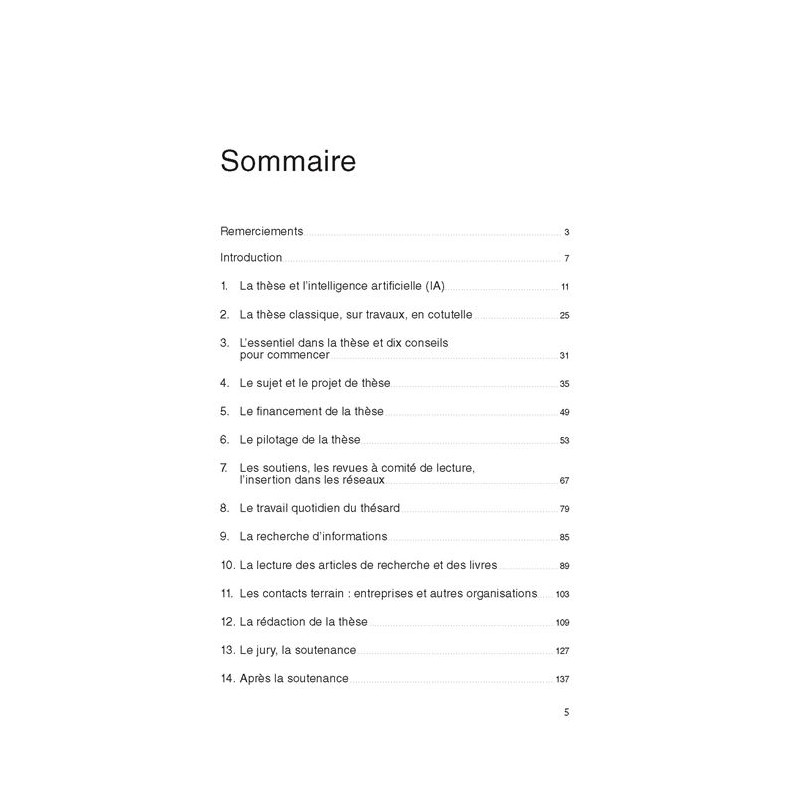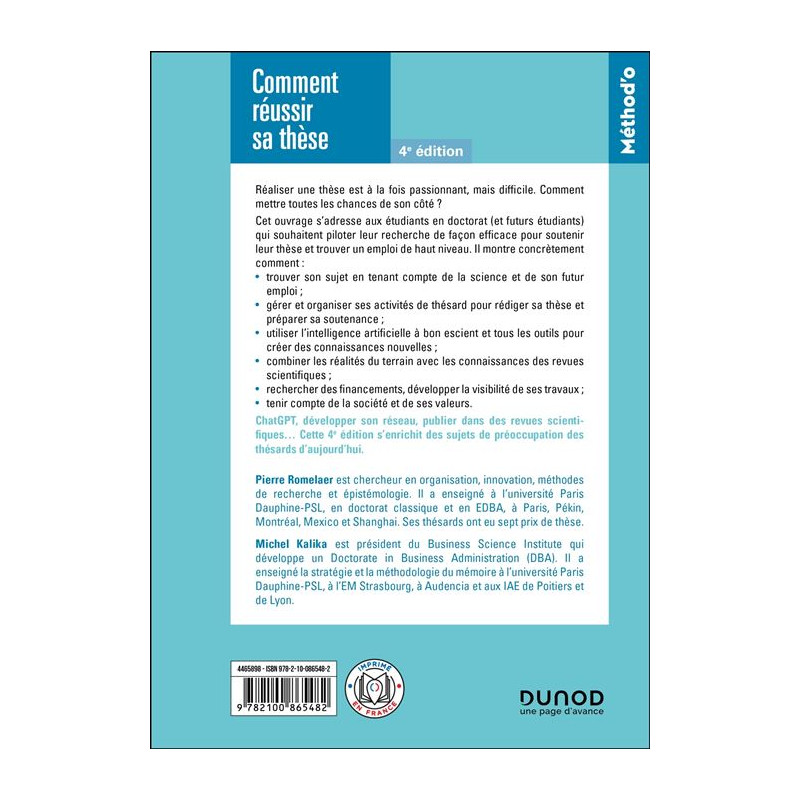 Réaliser une thèse est à la fois passionnant, mais difficile. Comment mettre toutes les chances de son côté ? Cet ouvrage s’adresse aux étudiants en doctorat (et futurs étudiants) qui souhaitent piloter leur recherche de façon efficace pour soutenir leur thèse et trouver un emploi de haut niveau. Il montre concrètement comment : trouver son sujet en tenant compte de la science et de son futur emploi ; gérer et organiser ses activités de thésard pour rédiger sa thèse et préparer sa soutenance ; utiliser l’intelligence artificielle à bon escient et tous les outils pour créer des connaissances nouvelles ; combiner les réalités du terrain avec les connaissances des revues scientifiques ; rechercher des financements, développer la visibilité de ses travaux ; tenir compte de la société et de ses valeurs. ChatGPT, développer son réseau, publier dans des revues scientifiques… Cette 4e édition s’enrichit des sujets de préoccupation des thésards d’aujourd’hui.