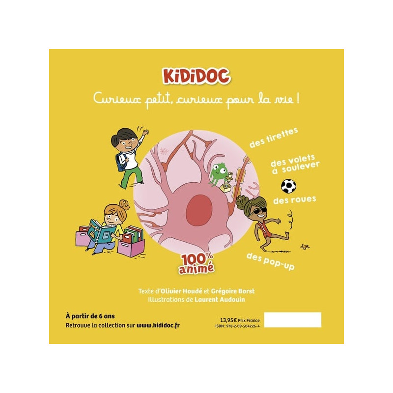 Tourne, pousse et soulève pour découvrir les secrets de cet organe plus rapide qu'Internet : le rôle de chaque lobe, comment voyagent les informations grâce aux neurones, les animaux ont-ils le même cerveau que nous, des jeux pour entraîner son cerveau et même des illusions d'optique pour le tester !