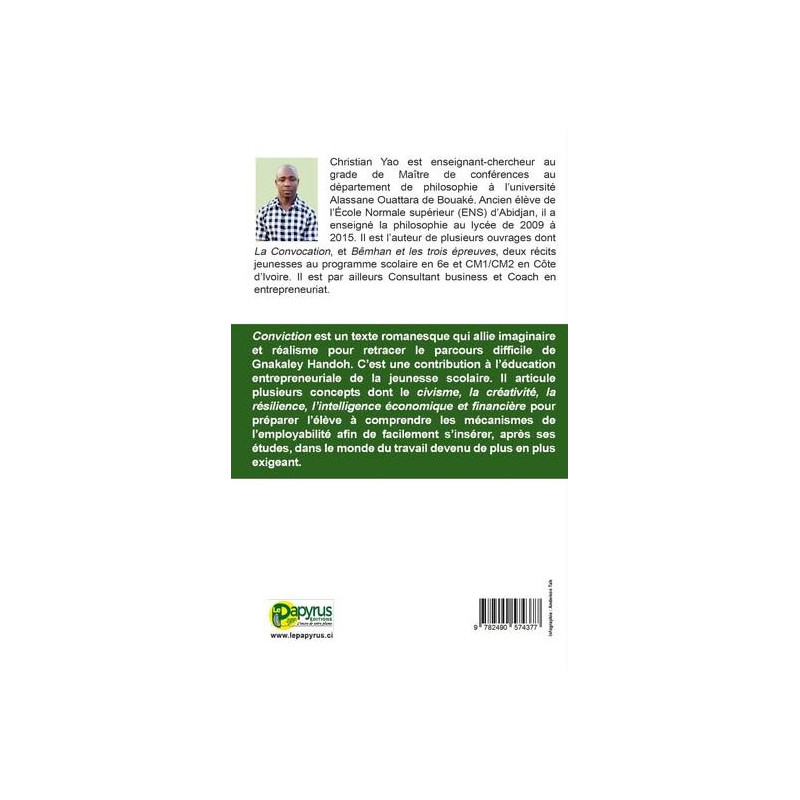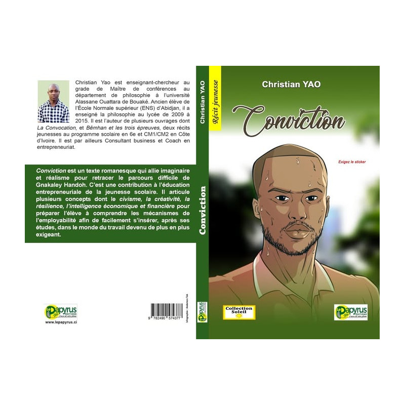 Conviction est un texte romanesque qui allie imaginaire et réalisme pour retracer le parcours difficile de Gnakaley Handoh. C'est une contribution à l'éducation entrepreneuriale de la jeunesse scolaire. Il articule plusieurs concepts dont le civisme, la créativité, la résilience,...