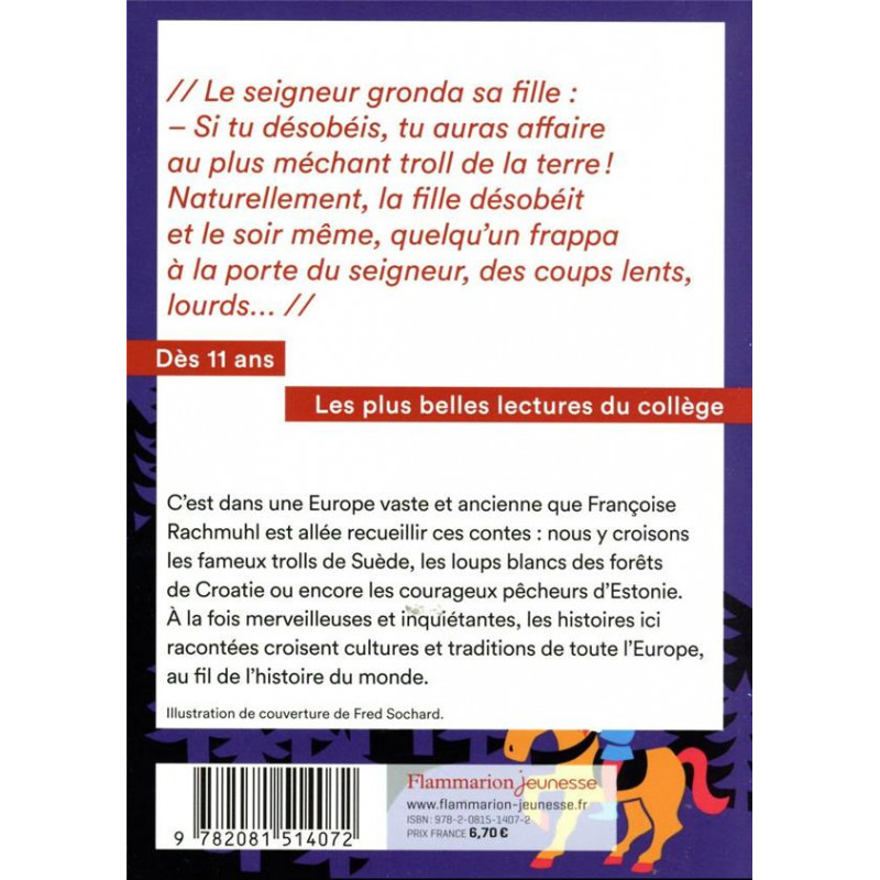 "Le seigneur gronda sa fille : - Si tu désobéis, tu auras affaire au plus méchant troll de la terre ! Naturellement, la fille désobéit et le soir même, quelqu'un frappa à la porte du seigneur, des coups lents, lourds..." C'est dans une Europe vaste et ancienne que Françoise Rachmuhl est allée recueillir ces contes : nous y croisons les fameux trolls de Suède, les loups blancs des forêts de Croatie ou encore les courageux pêcheurs d'Estonie. À la fois merveilleuses et inquiétantes, les histoires ici racontées croisent cultures et traditions de toute l'Europe, au fil de l'histoire du
