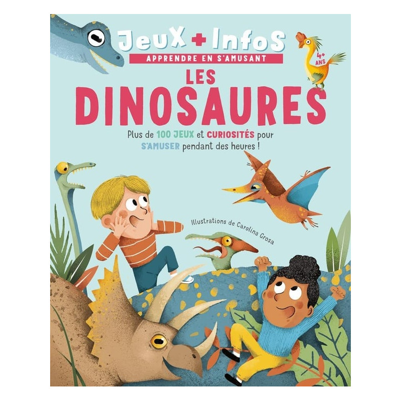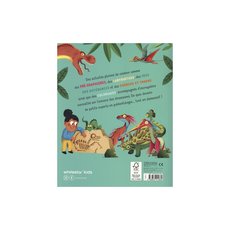 Tu y rencontreras une foule de petits jeux, comme celui des différences, de cherche et trouve, mais aussi des labyrinthes et des pages à colorier... Le tout accompagné d'infos et d'anecdotes rigolotes sur les dinosaures. Tout en jouant, les enfants apprendront un tas de choses sur la paléontologie, la biologie et l'écologie.