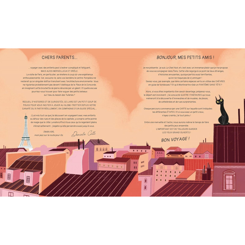 À Paris, nos petits voyageurs se laisseront guider par Le chat noir qui leur dévoilera de nombreux secrets sur le Louvre, la tour Eiffel et Notre Dame... Il connaît aussi de bonnes adresses pour faire un tour de manège ou savourer un goûter bien mérité ! Enfants et adultes s'amuseront également à faire voguer des petits bateaux sur les bassins du jardin des Tuileries et du Luxembourg, à découvrir des noms de rue abracadabrantes, à découvrir la capitale depuis sa plus grande avenue, la Seine, à bord d'un bateau mouche, et se délecteront, enfin, d'anecdotes sur les mystères et fantômes de la ville. Le tout accompagné de cartes, d'itinéraires et de descriptions adaptées aux tout petits. Les petits explorateurs seront comblés !