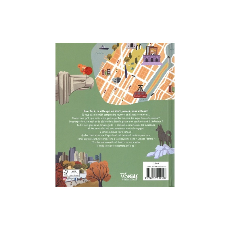 Mr Squirrel, un sympathique petit écureuil, qui connaît New York comme sa poche, a concocté quatre itinéraires qui enchanteront nos jeunes voyageurs. Un pique-nique à Central Park, une virée au musée d'histoire naturelle et au MET, un tour en téléphérique, une balade sur une coulée verte suspendue dans la ville, une bonne glace à Chinatown, le pont de Brooklyn, un ancien manège de près de 100 ans, la Statue de la Liberté et ses grands pieds... pour ne citer que quelques-unes des étapes. En prime, des petits jeux qui attiseront la curiosité des petits et raviront les petits visiteurs.
