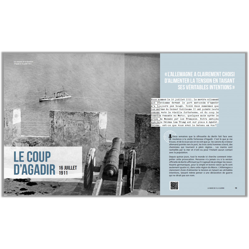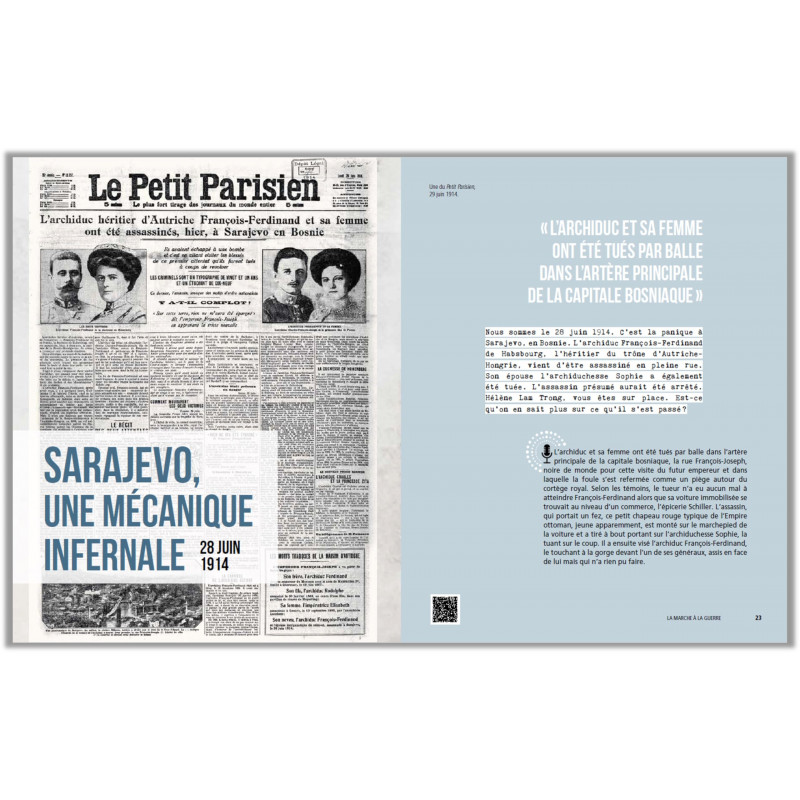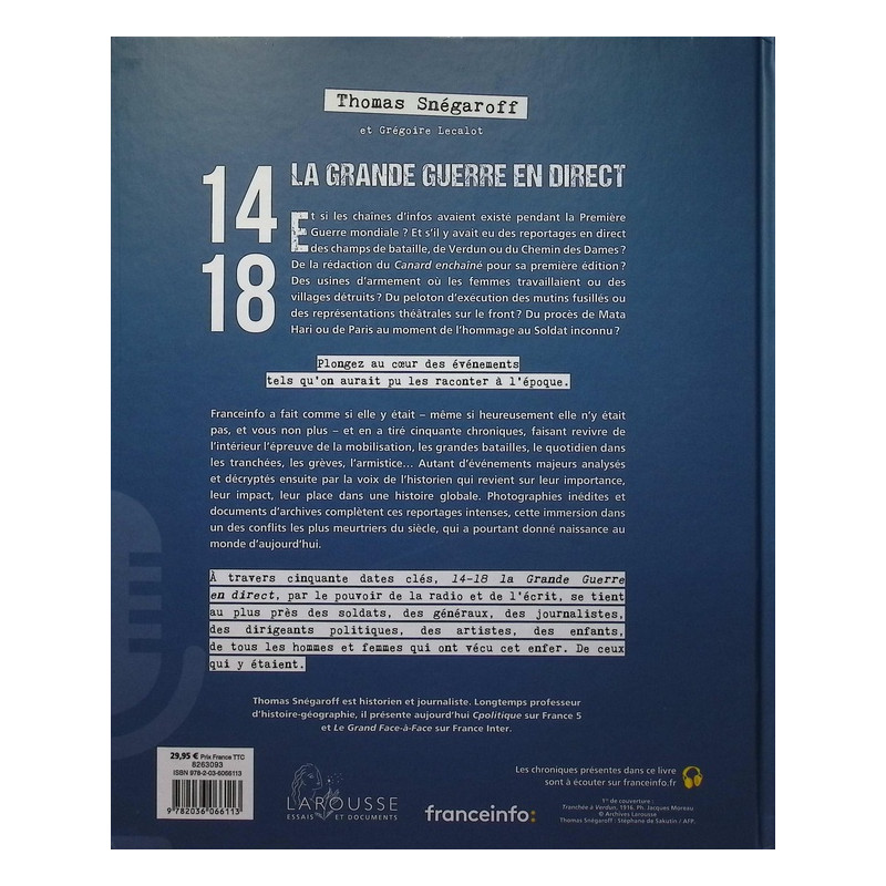 Autant d'événements majeurs analysés et décryptés ensuite par la voix de l'historien qui revient sur leur importance, leur impact, leur place dans une histoire globale. Photographies inédites et documents d'archives complètent ces reportages intenses, cette immersion dans un des conflits les plus meurtriers du siècle, qui a pourtant donné naissance au monde d'aujourd'hui. A travers cinquante dates clés, 14-18 la Grande Guerre en direct, par le pouvoir de la radio et de l'écrit, se tient au plus près des soldats, des généraux, des journalistes, des dirigeants politiques, des artistes, des enfants, de tous les hommes et femmes qui ont vécu cet enfer.