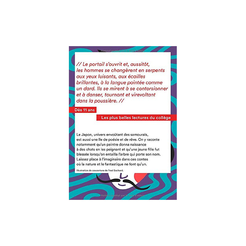 «Le portail s'ouvrit et, aussitôt, les hommes se changèrent en serpents aux yeux luisants, aux écailles brillantes, à la langue pointée comme un dard. Ils se mirent à se contorsionner et à danser, tournant et virevoltant dans la poussière.»Le Japon, univers envoûtant des samouraïs, est aussi une île de poésie et de rêve. On y raconte notamment qu'un peintre donna naissance à des chats en les peignant et qu'une jeune fille fut blessée lorsqu'on entailla l'arbre qui porte son nom.Laissez place à l'imaginaire dans ces contes où la nature et le fantastique ne font qu'un.