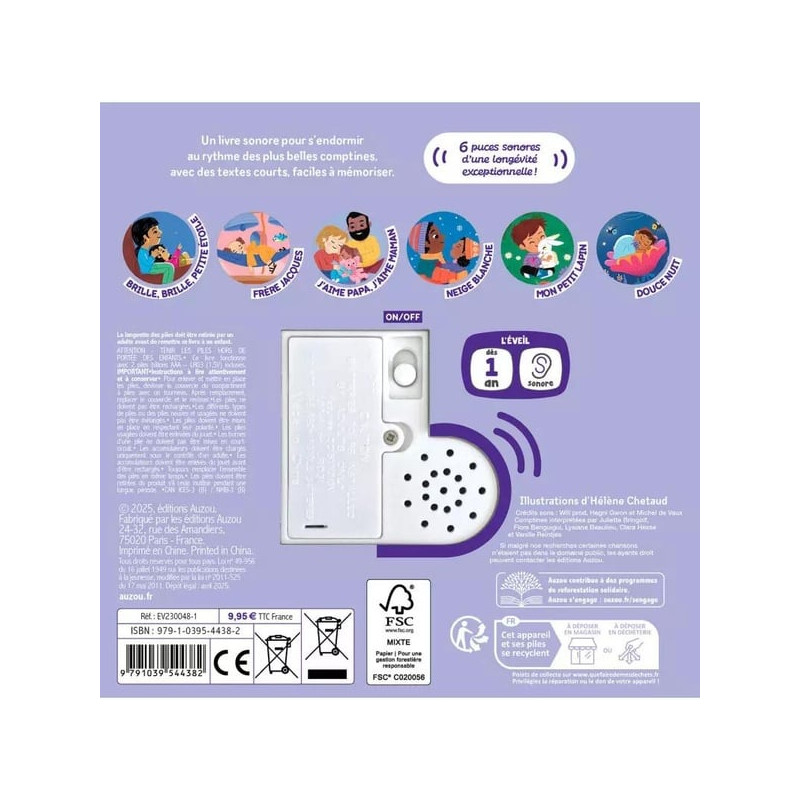 Un livre sonore pour s'endormir au rythme des plus belles comptines, avec des textes courts et faciles à mémoriser. 6 puces sonores d'une belle qualité auditives et d'une longévité exceptionnelle ! 6 comptines pour faire dodo,..