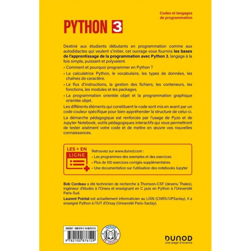 Destiné à tous ceux qui veulent s'initier à la programmation , qu'ils soient étudiants, enseignant ou autodidactes, cet ouvrage vous fournira les bases de l' apprentissage de la programmation avec Python 3 , langage à la fois simple, puissant et polyvalent. Accompagnée de nombreux exemples, la démarche pédagogique est renforcée par l'usage de la distribution Pyzo et des notebooks Jupyter, des outils pédagogiques interactifs qui permettent au lecteur de tester facilement son code et de mettre en œuvre les connaissances qu'il acquiert. De plus l'utilisation de la couleur permet de bien faire comprendre les différents éléments qui constituent le code. Outre les 25 exercices corrigés présents dans la version imprimée, cet ouvrage offre une centaine d'autres exercices corrigés accessibles sur le web. Le livre s'appuie sur la version Python 3.8 . Retrouvez sur https://www.dunod.com/EAN/9782100809141 et sur https://github.com/lpointal/appbclp : – Les programmes des exercices et des exemples. – Une documentation sur l'installation et l'utilisation des notebooks Jupyter. – Les exercices corrigés supplémentaires. Table des matières : Programmeur en Python. La calculatrice Python. Contrôle du flux d'instructions. Conteneurs standards. Fonctions et espaces de nommage. Modules et packages. Accès aux données. Programmation orientée objet. La programmation graphique orientée objet. Programmation avancée. L'écosystème Python