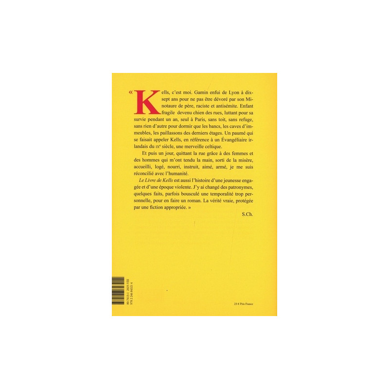 "Kell, c'est moi. Gamin enfui de Lyon à dix-sept ans pour ne pas être dévoré par son Minotaure de père, raciste et antisémite. Enfant fragile devenu chien des rues, luttant pour sa survie pendant un an, seul à Paris, sans toit, sans refuge, sans rien d'autre pour dormir que les bancs, les caves d'immeubles, les paillassons des derniers étages. Un paumé qui se … "Kell, c'est moi. Gamin enfui de Lyon à dix-sept ans pour ne pas être dévoré par son Minotaure de père, raciste et antisémite. Enfant fragile devenu chien des rues, luttant pour sa survie pendant un an, seul à Paris, sans toit, sans refuge, sans rien d'autre pour dormir que les bancs, les caves d'immeubles, les paillassons des derniers étages. Un paumé qui se faisait appeler Kells, en référence à un Evangéliaire irlandais du IXe siècle, une merveille celtique. Et puis un jour, quittant la rue grâce à des femmes et des hommes qui m'ont tendu la main, sorti de la misère, accueilli, logé, nourri, instruit, aimé, armé, je me suis réconcilié avec l'humanité. Le Livre de Kells est aussi l'histoire d'une jeunesse engagée et d'une époque violente. J'y ai changé des patronymes, quelques faits, parfois bousculé une temporalité trop personnelle, pour en faire un roman. La vérité vraie, protégée par une fiction appropriée. " S.Ch.