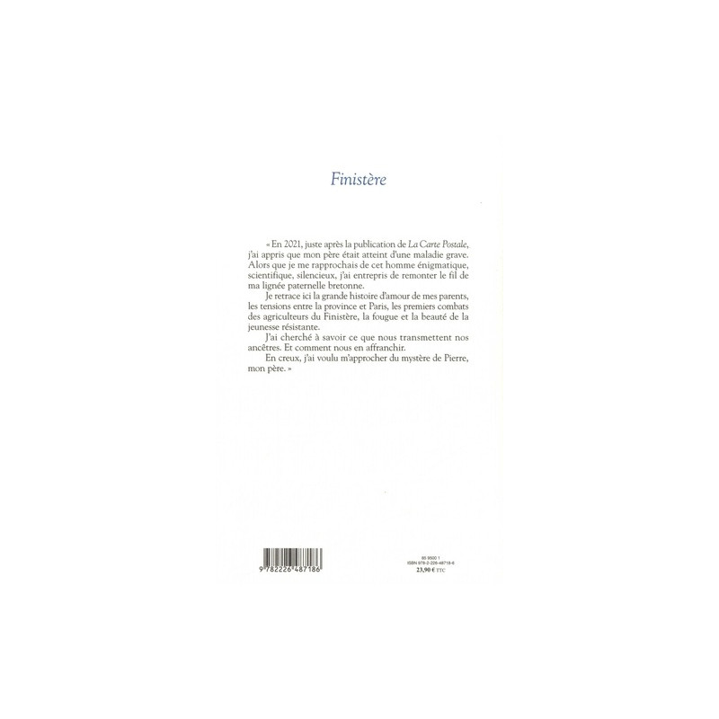 Finaliste - Prix Renaudot 1ère sélection du Grand Prix du Roman 2025 de l'Académie française Palmarès Livres Hebdo des livres préférés des libraires 1ère sélection du prix Interallié 2025 De très beaux portraits d'hommes, la délicate description de ce qui unit et sépare un père et sa fille. Olivia de Lamberterie, Elle Une folle odyssée qui vous émeut et vous donne … Finaliste - Prix Renaudot 1ère sélection du Grand Prix du Roman 2025 de l'Académie française Palmarès Livres Hebdo des livres préférés des libraires 1ère sélection du prix Interallié 2025 De très beaux portraits d'hommes, la délicate description de ce qui unit et sépare un père et sa fille. Olivia de Lamberterie, Elle Une folle odyssée qui vous émeut et vous donne envie de prendre un aller simple pour la Bretagne. Une très belle réflexion sur la famille et sur l'amitié. Augustin Trapenard - La Grande Librairie Anne Berest, une fois encore, nous livre une magnifique réflexion sur la famille. Page des libraires D'un style élégant. Anne Berest signe un roman éblouissant. Incontestablement Finistère est l'un des grands livres de cette rentrée. Version Femina Anne Berest poursuit sa grande exploration des "transmissions invisibles" et ses interrogations autour de la trans-généalogie. De quoi hérite-t-on ? "A chaque vacances, nous quittions notre banlieue pour la Bretagne, le pays de mon père, celui où il était né, ainsi que son père - et le père de son père, avant lui. Le voyage débutait gare Montparnasse, sous les fresques murales de Vasarely, leurs formes hexagonales répétitives, leurs motifs cinétiques, dont les couleurs saturées s'assombrissaient au fil du temps, et dont l'instabilité visuelle voulue par l'artiste, se transformait, année après année, en incertitude". Après La Carte Postale et Gabriële, Anne Berest déploie un nouveau chapitre de son œuvre romanesque consacrée à l'exploration de son arbre généalogique : la branche bretonne, finistérienne, remontant à son arrière-grand-père. Ici, la petite et la grande Histoire ne cessent de s'entremêler, depuis la création des premières coopératives paysannes jusqu'à mai 68, en passant par l'Occupation allemande dans un village du Léon et la destruction de la ville de Brest.