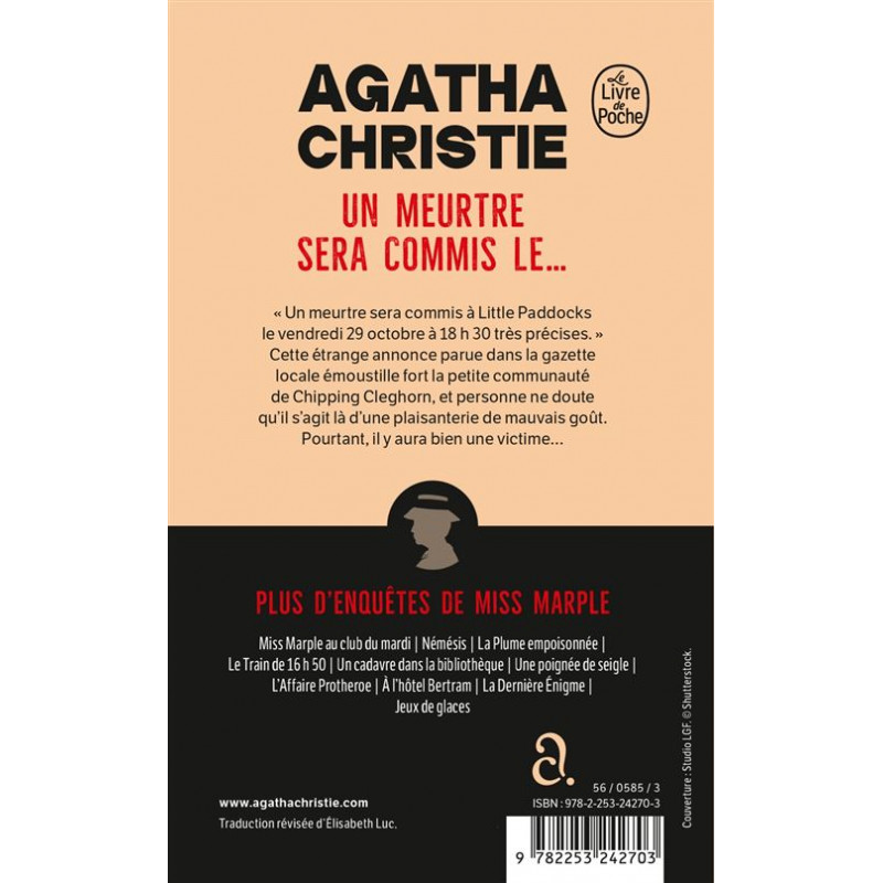 "Un meurtre sera commis à Little Paddocks le vendredi 29 octobre à 18 heures 30 très précises." Cette étrange annonce parue dans la gazette locale émoustille fort la petite communauté de Chipping Cleghorn, et personne ne doute qu'il s'agit là d'une plaisanterie de mauvais goût. Pourtant, il y aura bien une victime...