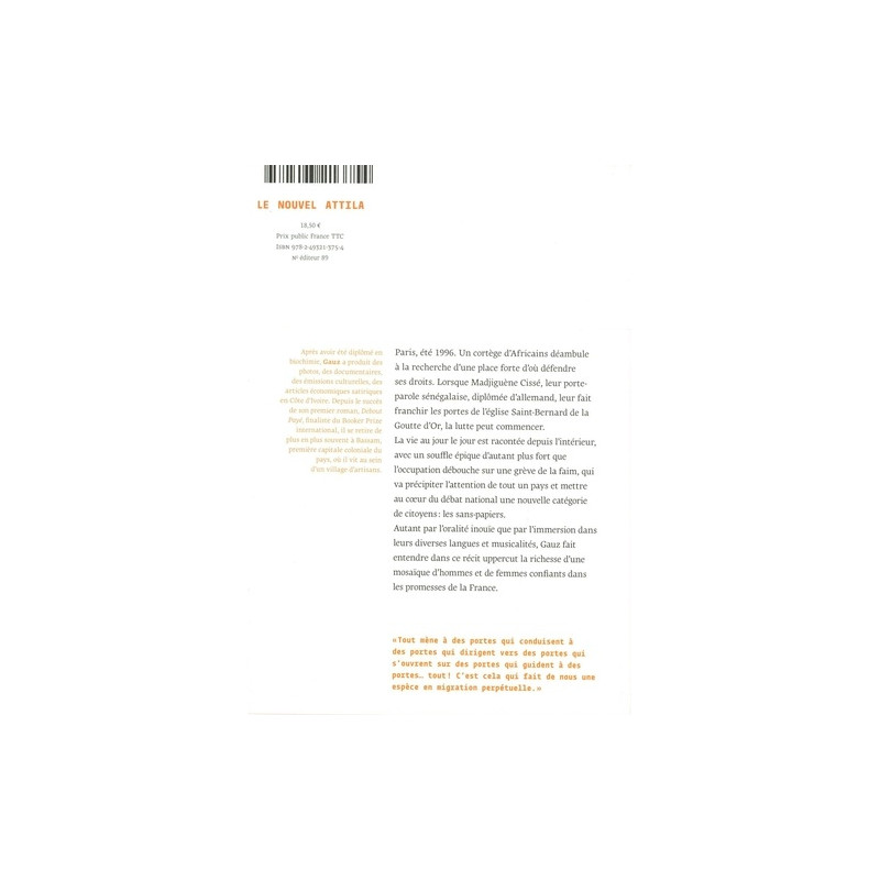 Paris, été 1996. Un cortège d'Africains déambule à la recherche d'une place forte d'où défendre ses droits. Lorsque Madjiguène Cissé, leur porte-parole sénégalaise, diplômée d'allemand, leur fait franchir les portes de l'église Saint-Bernard de la Goutte d'Or, la lutte peut commencer. La vie au jour le jour est racontée depuis l'intérieur, avec un souffle … Paris, été 1996. Un cortège d'Africains déambule à la recherche d'une place forte d'où défendre ses droits. Lorsque Madjiguène Cissé, leur porte-parole sénégalaise, diplômée d'allemand, leur fait franchir les portes de l'église Saint-Bernard de la Goutte d'Or, la lutte peut commencer. La vie au jour le jour est racontée depuis l'intérieur, avec un souffle épique d'autant plus fort que l'occupation débouche sur une grève de la faim, qui va précipiter l'attention de tout un pays et mettre au cœur du débat national une nouvelle catégorie de citoyens : les sans-papiers. Autant par l'oralité inouïe que par l'immersion dans leurs diverses langues et musicalités, Gauz fait entendre dans ce récit uppercut la richesse d'une mosaïque d'hommes et de femmes confiants dans les promesses de la France.