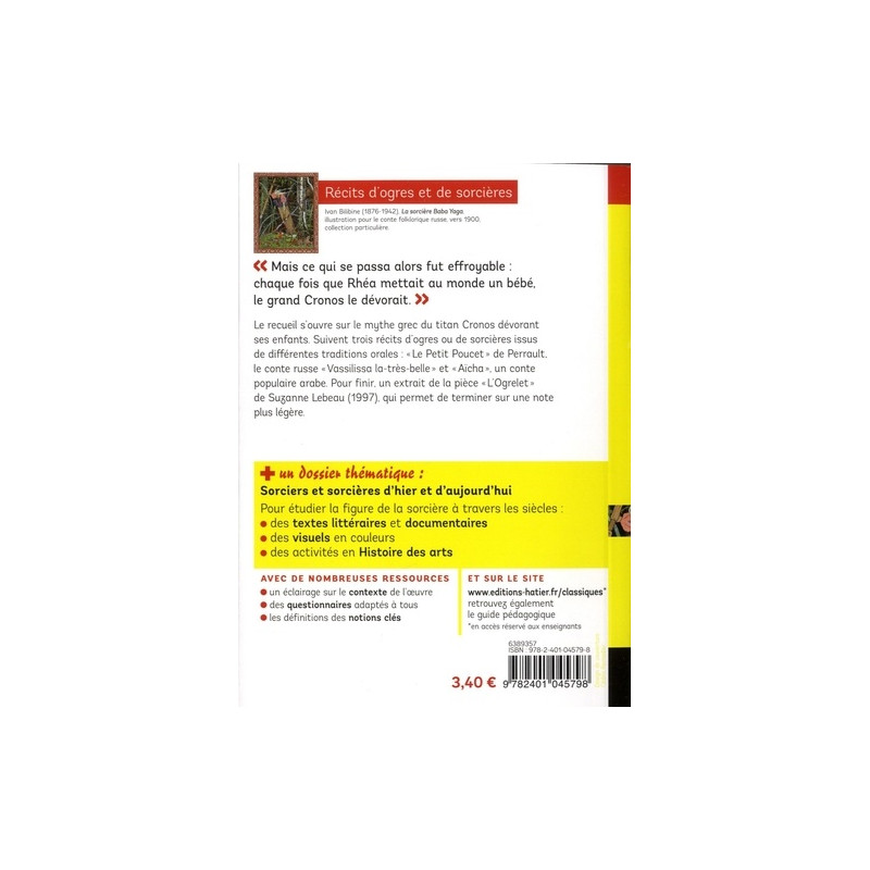 En lien avec le thème "Rencontrer des monstres : expérience de l'autre, expérience de soi " du programme de français en 6e, cinq récits d'ogres et de sorcières, d'Hésiode à Pierre Gripari. En complément, un dossier thématique sur les figures du sorcier et de la sorcière, avec des photos en couleurs. L'anthologie Le recueil s'ouvre sur le mythe grec du titan Cronos dévorant ses enfants. Suivent trois récits d'ogres ou de sorcières issus de différentes traditions orales : " Le Petit Poucet " de Charles Perrault, le conte russe " Vassilissa la-très-belle " qui met en scène la terrible Baba-Yaya, et " Aïcha " , un conte populaire arabe. Pour finir, un extrait de L'Ogrelet, de Suzanne Lebeau, permet de s'interroger sur l'ogre que chacun porte en soi... Le dossier pédagogique Avec toutes les ressources utiles au collégien : - des repères sur le contexte de chaque récit ; - des notes qui éclairent la lecture du texte ; - des questionnaires, avec la définition des notions en jeu. En complément : le dossier thématique " Sorciers et sorcières, de l'Antiquité à nos jours" Un dossier structuré en trois sections : 1. Les sorcières de la mythologie grecque, 2. Le Moyen Age des sorcières, 3. Les sorcières dans la fiction moderne ; dans chacune, des documents (textes et iconographies en couleurs) introduits et associés à des mini-questionnaires. Pour l'enseignant Sur www. editions-hatier. fr, dans la fiche article de l'ouvrage, un guide pédagogique et des fiches photocopiables en accès gratuit réservé.