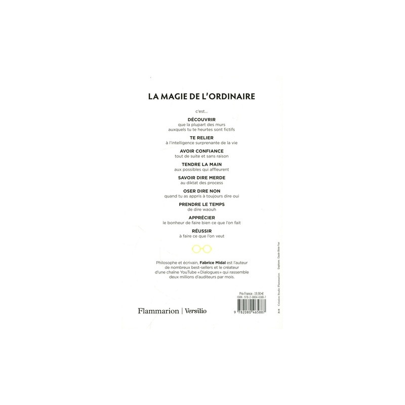 La Magie de l'ordinaire c'est... DECOUVRIR que la plupart des murs auxquels tu te heurtes sont fictifs TE RELIER à l'intelligence surprenante de la vie AVOIR CONFIANCE tout de suite et sans raison TENDRE LA MAIN aux possibles qui affleurent SAVOIR DIRE MERDE au diktat des process OSER DIRE NON quand tu as appris à toujours dire oui PRENDRE LE TEMPS de dire waouh APPRECIER le bonheur de faire bien ce que l'on fait REUSSIR à faire ce que l'on veut.