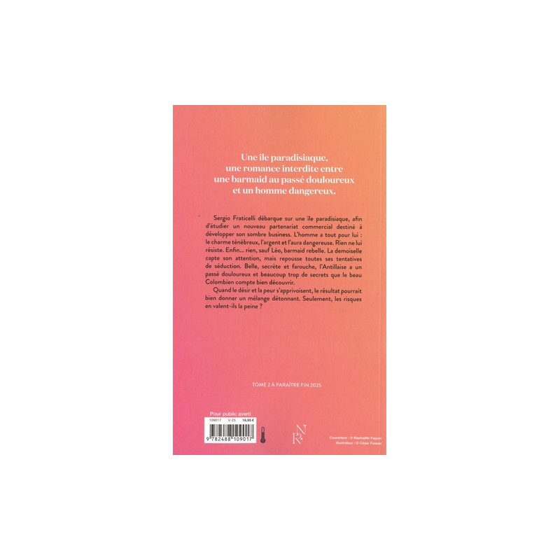 Une île paradisiaque, une romance interdite entre une barmaid au passé douloureux et un homme dangereux. Sergio Fraticelli débarque sur une île paradisiaque, afin d'étudier un nouveau partenariat commercial destiné à développer son sombre business. L'homme a tout pour lui : le charme ténébreux, l'argent et l'aura dangereuse. Rien ne lui résiste. Enfin...… Une île paradisiaque, une romance interdite entre une barmaid au passé douloureux et un homme dangereux. Sergio Fraticelli débarque sur une île paradisiaque, afin d'étudier un nouveau partenariat commercial destiné à développer son sombre business. L'homme a tout pour lui : le charme ténébreux, l'argent et l'aura dangereuse. Rien ne lui résiste. Enfin... rien, sauf Léo, barmaid rebelle. La demoiselle capte son attention, mais repousse toutes ses tentatives de séduction. Belle, secrète et farouche, l'Antillaise a un passé douloureux et beaucoup trop de secrets que le beau Colombien compte bien découvrir. Quand le désir et la peur s'apprivoisent, le résultat pourrait bien donner un mélange détonnant. Seulement, les risques en valent-ils la peine ? TOME 2 A PARAITRE FIN 2025