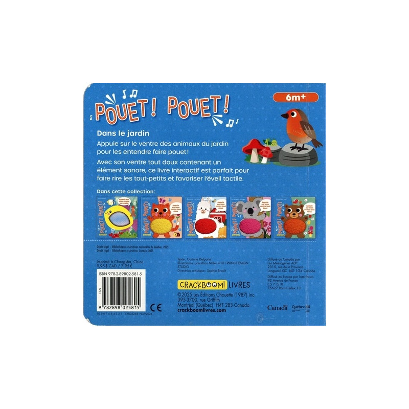 Appuie sur le ventre des animaux du jardin pour les entendre faire pouet ! Avecson ventre tout doux contenant un élément sonore, ce livre interactif est parfait pour faire rire les tout-petits et favoriser l'éveil tactile.