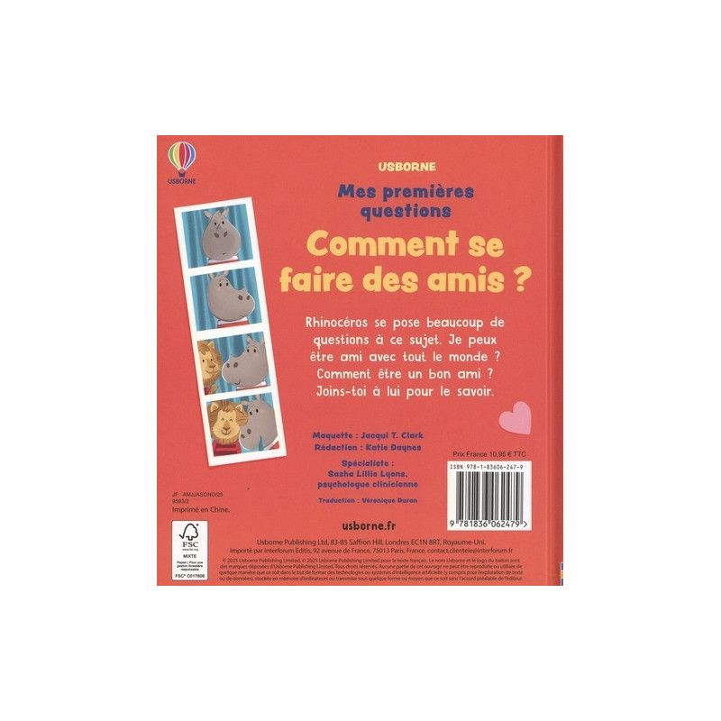 Rhinocéros se pose beaucoup de questions sur l'amitié et comment se faire des amis. En soulevant les rabats de ce livre rassurant, les enfants pourront découvrir des réponses à toutes ces questions qui les préoccupent. Écrit en collaboration avec un psychologue pour enfants, il est rempli de conseils pratiques et de choses à discuter pour renforcer la confiance en soi et l'empathie des enfants.