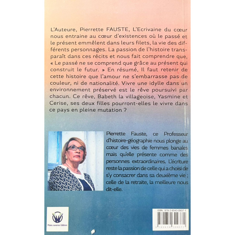 L'auteure, Pierrette FAUSTE, L'Ecrivaine du cœur nous entraine au cour d'existences où le passé et le présent emmêlent dans leurs filets, la vie des différents personnages. La passion de l'histoire transparaît dans ces récits et nous fait comprendre que, « Le passé ne se comprend que grâce au présent qui construit le futur. » En résumé, Il faut retenir de cette histoire que l'amour ne s'embarrasse pas de couleur, ni de nationalité. Vivre une idylle dans un environnement préservé est le rêve poursuivi par chacun. Ce rêve, Babeth la villageoise, Yasmine et Cerise, ses deux filles pourront-elles le vivre dans ce pays en pleine mutation ?
