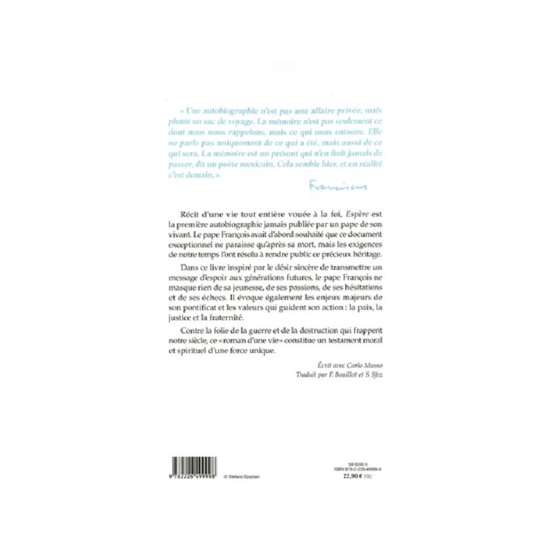Récit d'une vie tout entière vouée à la foi, Espère est la première autobiographie jamais publiée par un pape de son vivant. Le pape François avait d'abord souhaité que ce document exceptionnel ne paraisse qu'après sa mort, mais les exigences de notre temps l'ont résolu à rendre public ce précieux héritage. Dans ce livre inspiré par le désir sincère de transmettre un message d'espoir aux générations futures, le Pape François ne masque rien de sa jeunesse, de ses passions, de ses hésitations et de ses échecs.