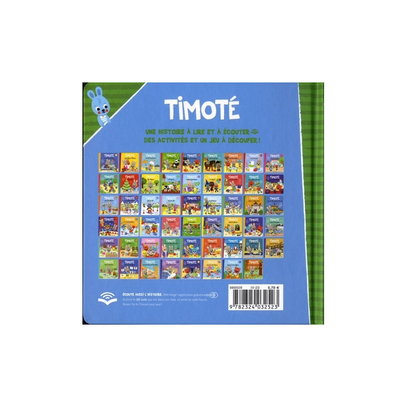 Timoté est un petit lapin qui, au fil des albums, partage sa vie avec ses petits lecteurs. Aujourd'hui tante Mimi lui fait un très joli cadeau : une trottinette. Très vite, Timoté apprend à s'en servir assis et bientôt, comme un grand debout ! Attention ! Il ne faut pas oublier de mettre casque et genouillères avant de partir et bien s'arrêter au bout du trottoir !