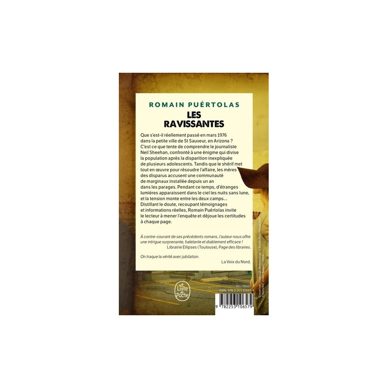 Que s'est-il réellement passé en mars 1976 dans la petite ville de Saint Sauveur, en Arizona ? C'est ce que tente de comprendre le journaliste Neil Sheehan, confronté à une énigme qui divise la population : la disparition de plusieurs adolescents. Tandis que le shérif met tout en oeuvre pour résoudre l'affaire, les mères des disparus accusent une communauté de marginaux installée depuis un an dans les parages. D'étranges lumières apparaissent dans le ciel les nuits sans lune, et la tension monte entre les deux camps... Distillant le doute, recoupant témoignages et informations réelles, Romain Puértolas invite le lecteur à mener l'enquête dans ce roman dont chaque page déjoue les certitudes.