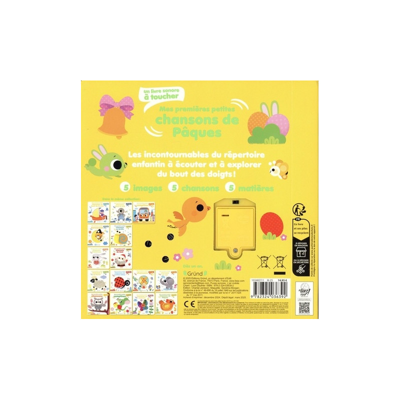 Découvre l'adorable chanson " Cocodi, cocoda " et caresse le duvet de la poulette. " Danse avec les lapins " et fais bouger leurs oreilles toutes douces. Découvre " Le lapin pistache " et sa fourrure toute douce. Effleure les paillettes sur les oeufs de Pâques en écoutant " C'est Pâques ce matin " et les cloches dans " Din, ding, dong " !