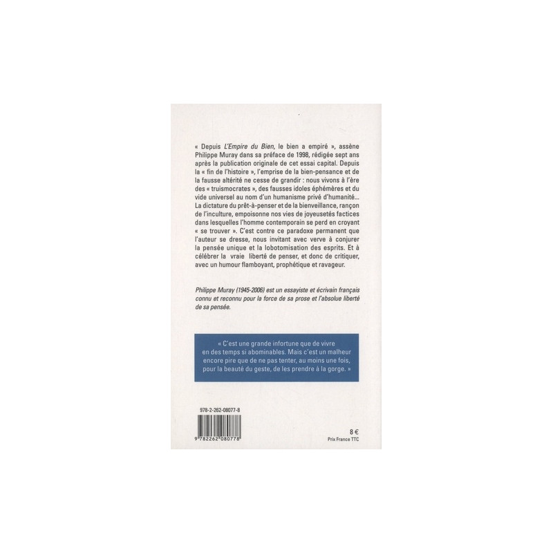 "Depuis L'Empire du Bien, le bien a empiré", assène Philippe Muray dans sa préface de 1998, rédigée sept ans après la publication originale de cet essai capital. Depuis la "fin de l'histoire", l'emprise de la bien-pensance et de la fausse altérité ne cesse de grandir : nous vivons à l'ère des "truismocrates", des fausses idoles éphémères et du vide universel au nom d'un humanisme privé d'humanité...