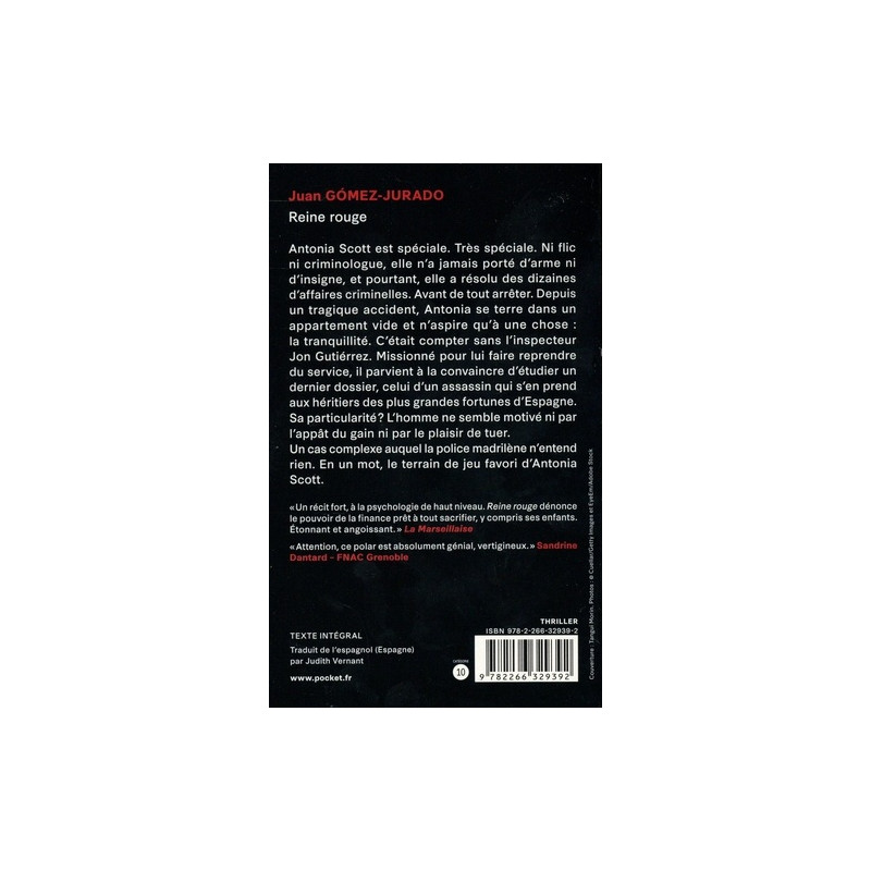 AuFeminin " Le meilleur auteur de thrillers en Europe. " Magazine littéraire Zenda UN INCONTOURNABLE : Roman policier nouveauté 2023 ; Reine Rouge de Juan Gomez Jurado et ses 2 millions d'exemplaires vendus est le thriller phénomène de cette année. A lire pour frissonner où à offrir, ce thriller est récompensé par le prix du meilleur roman International au festival de Cognac, c'est un indispensable dans la bibliothèque de tous les lecteurs passionnés d'enquêtes policières : suspens garanti.