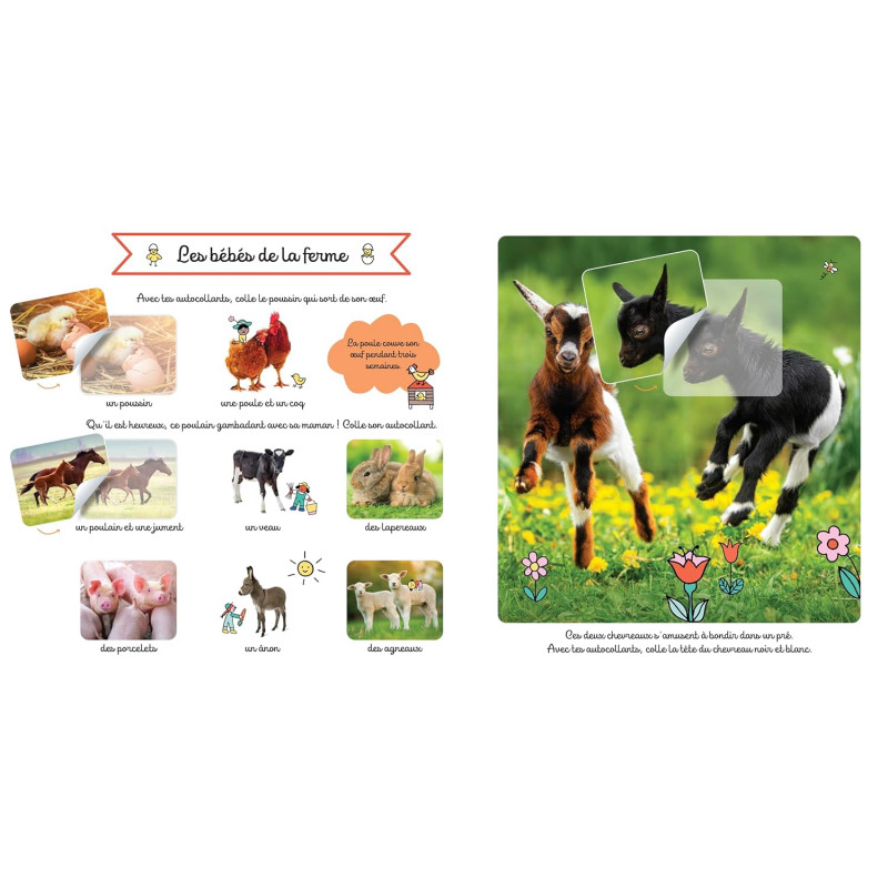 Retrouve tous les animaux les plus chou : les chiots et les chatons, mais aussi tous les bébés de la ferme, des montagnes, de la jungle et des rivières... A toi de coller un bébé kangourou dans la poche de sa maman ou un baleineau au fond de l'eau ! Des autocollants, aux formes adaptées aux tout-petits ! Des grandes photos pour une meilleure appréhension du monde réel. Un apprentissage_ où l'enfant s'éveille par l'expérience.
