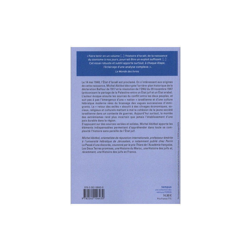Le 14 mai 1948, l'État d'Israël est proclamé. S'intéressant aux origines de cette naissance, Michel Abitbol décrypte l'arrière-plan historique de la déclaration Balfour de 1917 et la résolution de l'ONU du 29 novembre 1947 (préconisant le partage de la Palestine entre un État juif et un État arabe). L'auteur évoque ensuite les sources du conflit entre les deux peuples, et suit pas à pas l'émergence d'une " nation " israélienne et d'une culture hébraïque moderne nées du brassage des vagues successives d'immigrants.