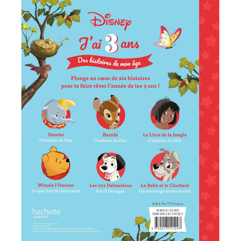 La collection de recueils d'histoires Disney pour chaque âge ! Dans ce beau livre de 96 pages, l'enfant découvre 6 histoires illustrées, avec un graphisme simple et un vocabulaire adapté à son âge. Au cours de sa lecture, des questions ponctuelles lui seront posées pour l'accompagner dans sa compréhension de l'intrigue et pour aiguiser son sens de l'observation. Puis, à la fin de l'ouvrage, une double page de synthèse invite enfant et parent à échanger ensemble sur les histoires. Dès 3 ans. Contient les histoires : Dumbo - L'histoire du film, Bambi - L'histoire du film, Le Livre de la Jungle - L'histoire du film, Winnie l'Ourson - Ce que font les bons amis, Les 101 Dalmatiens - Patch Ouragan, La Belle et le Clochard - Un sauvetage mouvementé