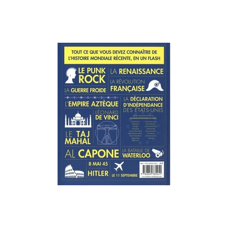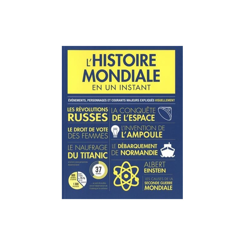 L'Histoire mondiale en un instant rassemble tous les moments cruciaux de l'histoire moderne et contemporaine en un seul volume. Chaque page est consacrée à un événement historique majeur et résume les faits les plus importants de manière concise, claire et visuelle, ce qui signifie que vous pouvez combler vos lacunes... en un instant. De la guerre de Cent Ans à la libération de Nelson Mandela, de la Révolution française à l'invention de la voiture, de la Seconde Guerre mondiale à la crise des missiles de Cuba, chaque événement clé, personnage ou tournant est expliqué avec un texte et des graphiques succincts et vivants.