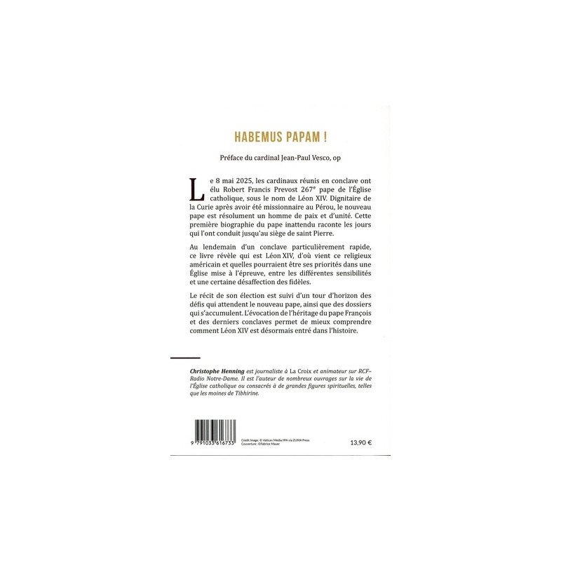 Le récit de son élection est suivi d'un tour d'horizon des défis qui attendent le nouveau pape, ainsi que des dossiers qui s'accumulent. L'évocation de l'héritage du pape François et des derniers conclaves permet de mieux comprendre comment Léon XIV est désormais entré dans l'histoire. Christophe Henning est journaliste à La Croix et animateur sur RCF-Radio Notre-Dame. Il est l'auteur de nombreux ouvrages sur la vie de l'Eglise catholique ou consacrés à de grandes figures spirituelles, telles que les moines de Tibhirine.