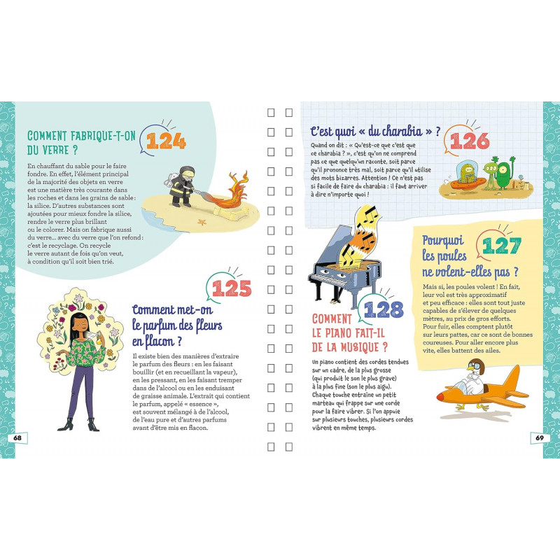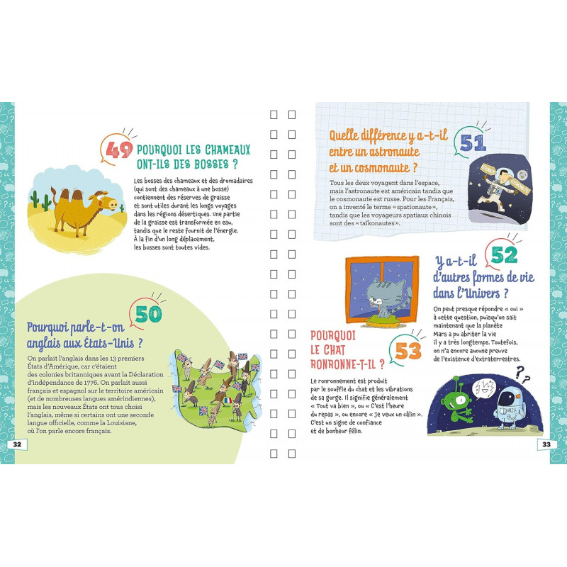 Pourquoi les abeilles font-elles du miel ? Pourquoi y a-t-il des pyramides en Egypte ? L'Univers est-il infini ? Les hommes préhistoriques chassaient-ils les dinosaures ? Tu as envie de savoir pourquoi la Terre est ronde, s'il existe encore des pirates de nos jours, ou encore qui a inventé le chocolat ? Découvre plus de 150 questions sur les animaux, le corps humain, l… Pourquoi les abeilles font-elles du miel ? Pourquoi y a-t-il des pyramides en Egypte ? L'Univers est-il infini ? Les hommes préhistoriques chassaient-ils les dinosaures ? Tu as envie de savoir pourquoi la Terre est ronde, s'il existe encore des pirates de nos jours, ou encore qui a inventé le chocolat ? Découvre plus de 150 questions sur les animaux, le corps humain, la nature ou les sciences. Ce livre t'apporte toutes les réponses ! Pour terminer ta lecture, teste tes connaissances avec des quiz et des jeux !